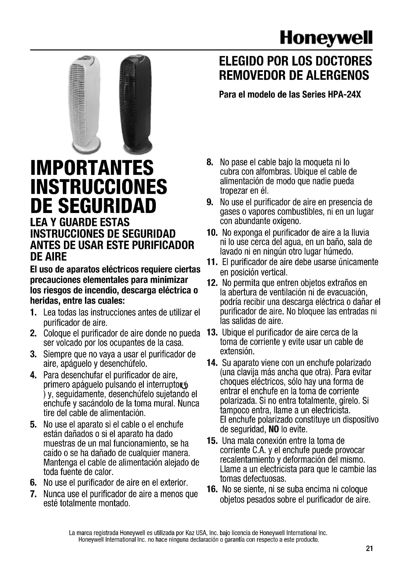 Para el modelo de las Series HPA-24X La marca registrada Honeywell es utilizada por Kaz USA, Inc. bajo licencia de Honeywell International Inc. Honeywell International Inc. no hace ninguna declaración o garantía con respecto a este producto.22