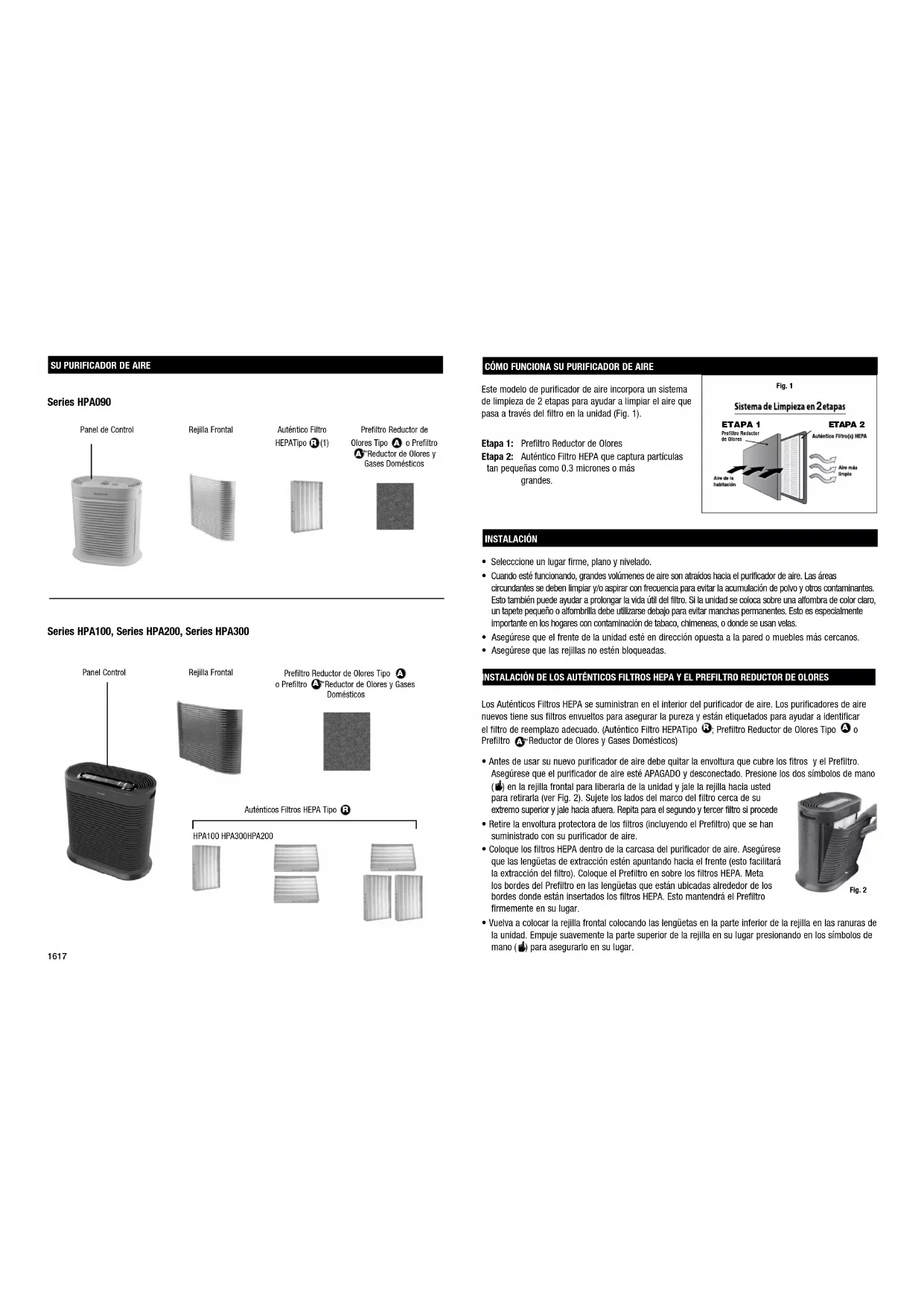CÓMO FUNCIONA SU PURIFICADOR DE AIRE Este modelo de purificador de aire incorpora un sistema de limpieza de 2 etapas para ayudar a limpiar el aire que pasa a través del filtro en la unidad (Fig. 1). Etapa 1: Prefiltro Reductor de Olores Etapa 2: Auténtico Filtro HEPA que captura partículas tan pequeñas como 0.3 micrones o más grandes. ETAPA