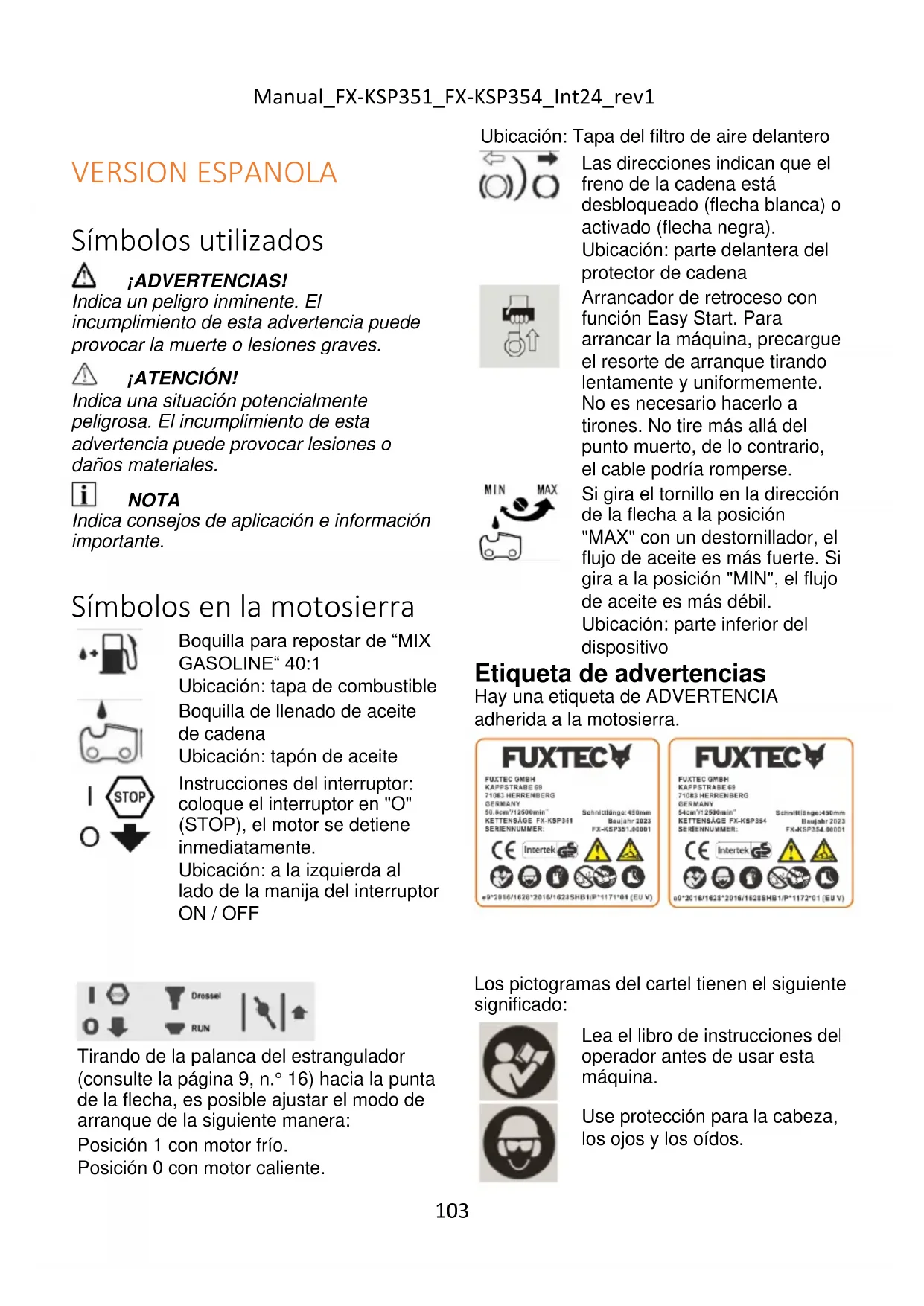 Esto es especialmente cierto en lugares donde hay líquidos, gases o polvos inflamables. ◼ Mantenga a los niños y otras personas no autorizadas alejadas del área de trabajo cuando utilice la motosierra. Estas distracciones pueden hacer que pierda el control de la motosierra. Seguridad de las personas ◼ Esté alerta, preste atención a lo que hace y use el sentido común cuando trabaje con la motosierra. Nunca use la motosierra si está cansado o bajo la influencia de drogas, alcohol o medicamentos. Un momento de distracción mientras trabaja con la motosierra puede provocar lesiones graves. ◼ Use equipo de protección personal y gafas protectoras. El uso de equipo de protección personal, como máscara contra el polvo, zapatos de seguridad antideslizantes, casco protector y protección auditiva, reduce el riesgo de lesiones. ◼ Use ropa adecuada. No use ropa suelta o joyas. Mantenga el pelo, la ropa y los guantes alejados de las piezas móviles. La ropa suelta, las joyas o el pelo largo pueden quedar atrapados en las piezas móviles. ◼ Evite posturas anormales. Garantice un apoyo seguro y mantenga siempre el equilibrio. Esto le ayudará a controlar la motosierra en situaciones inesperadas. Riesgos residuales − Incluso cuando la herramienta se utiliza correctamente, siempre existe un riesgo residual que no se puede descartar. Del tipo y construcción de la motosierra, se pueden deducir los siguientes peligros potenciales: − Contacto con cadena desprotegida (cortes) − Contacto con la cadena circular de la motosierra (cortes) − Movimientos repentinos e inesperados de la barra guía con la cadena (cortes) − Partes expulsadas de la cadena de la motosierra − Expulsión de partes del material a cortar − Daño auditivo si no se usa la protección auditiva prescrita − Inhalación de partículas de material de corte y gases de escape del motor de combustión − Contacto de la piel con gasolina Instrucciones de seguridad adicionales ◼ Apague la motosierra en las siguientes condiciones: − si el dispositivo se deja desatendido; − antes de comprobar, limpiar o realizar cualquier otro trabajo en el aparato; − si la unidad comienza a vibrar excesivamente. ◼ Durante el proceso de corte, asegúrese de que no haya personas (especialmente niños) o animales en el área de trabajo. ◼ Solo use la motosierra en condiciones de clima seco. Mantenga la motosierra alejada de la lluvia y la humedad. ◼ Asegúrese de que la cadena no entre en contacto con el suelo u otros objetos. ◼ Espere a que la motosierra se detenga antes de dejarla. ◼ Nunca deje el aparato desatendido durante las interrupciones del trabajo y guárdelo en un lugar seguro. ◼ Siempre apague la motosierra cuando la transporte a otros lugares de trabajo. ◼ Asegúrese de que todos los protectores y mangos estén colocados cuando use la unidad. ◼ Nunca opere con una motosierra incompleta o con modificaciones no autorizadas. ◼ No opere con la motosierra excepto en las condiciones técnicas específicas proporcionadas por el fabricante. Las modificaciones no autorizadas del aparato excluyen la responsabilidad del fabricante por cualquier daño resultante.Manual_FX-KSP351_FX-KSP354_Int24_rev1