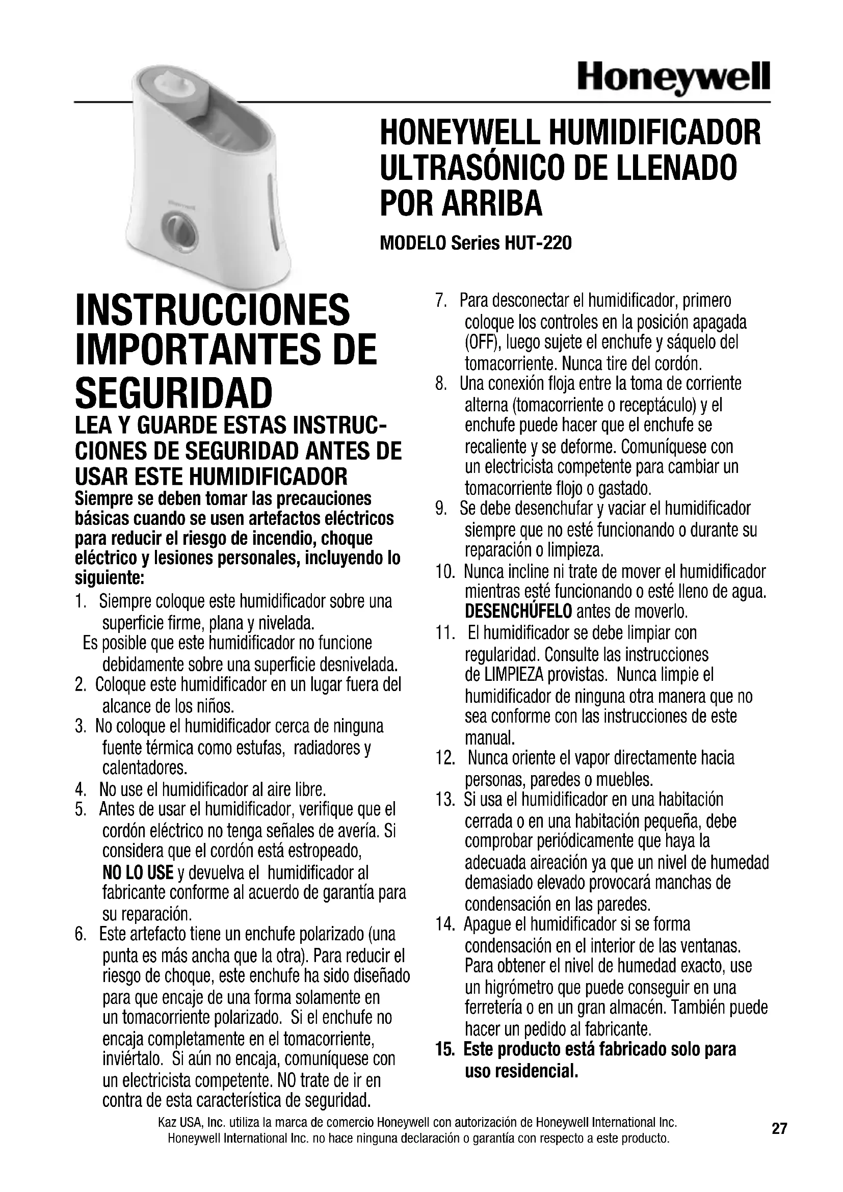 uso residencial. Kaz USA, Inc. utiliza la marca de comercio Honeywell con autorización de Honeywell International Inc. Honeywell International Inc. no hace ninguna declaración o garantía con respecto a este producto. HONEYWELL HUMIDIFICADOR
