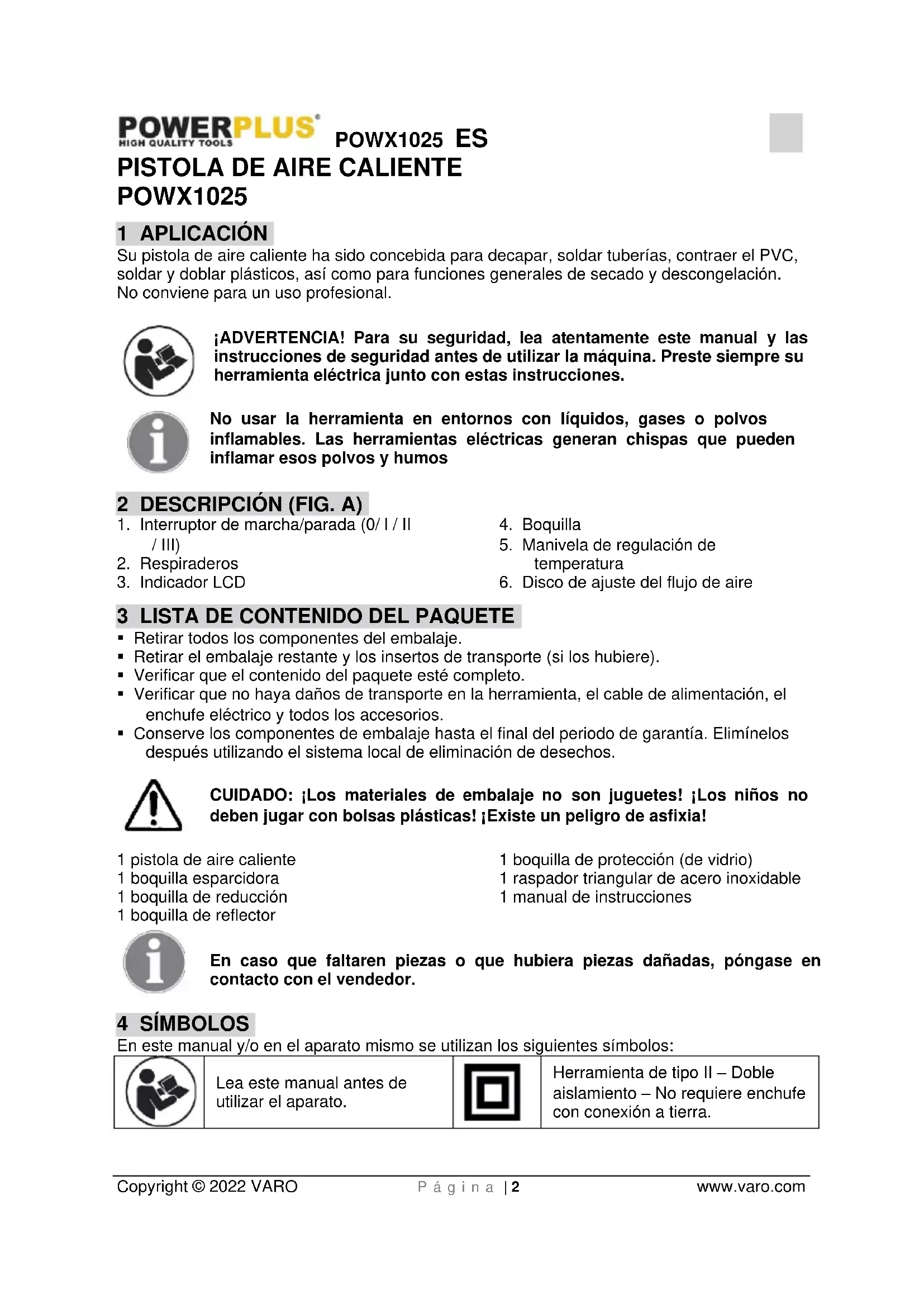 Herramienta de tipo II – Doble aislamiento – No requiere enchufe con conexión a tierra.POWX1025 ES Copyright © 2022 VARO P á g i n a | 3 www.varo.com