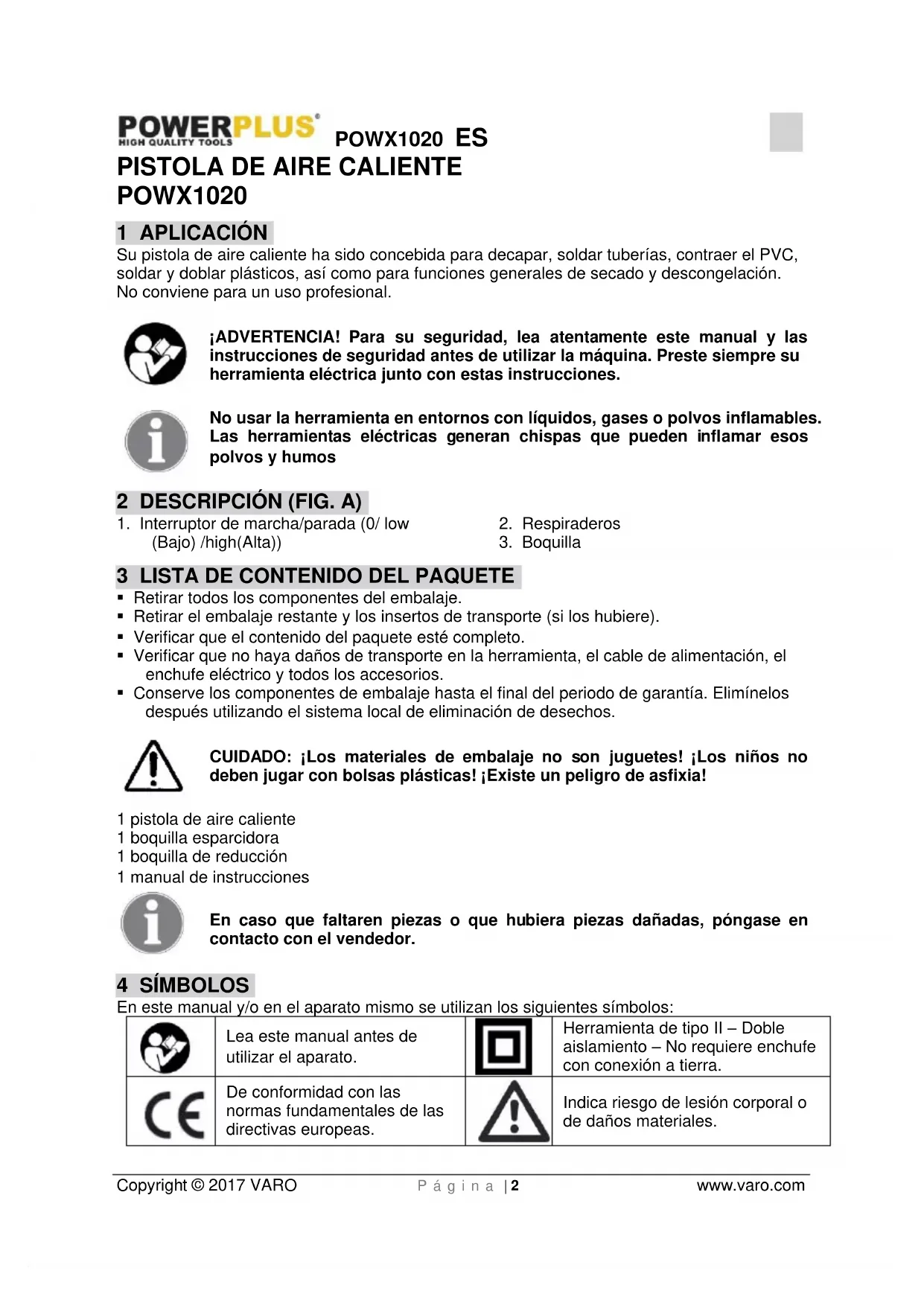Voltaje 230-240 V – 50 Hz Potencia absorbida 2000 W Rango de temperaturas del aire 50°-580 °C Corriente de aire 300-500 l/min 11 GARANTÍA Este producto está garantizado por un periodo de 36 meses, efectivos desde la fecha de compra por el primer usuario. Esta garantía cubre cualquier fallo de material o de producción excluyendo: baterías, cargadores, piezas defectuosas debido al desgaste normal tales como rodamientos, escobillas, cables y enchufes, o accesorios tales como brocas, hojas de sierra, etc.; los daños o defectos causados por uso abusivo, accidentes o alteraciones del producto; ni los costes de transporte. Los daños y/o defectos que fueren la consecuencia de un uso indebido tampoco están cubiertos por las disposiciones de esta garantía. Igualmente, declinamos toda responsabilidad por lesiones corporales causadas por el uso inadecuado de la herramienta. Las reparaciones deben ser efectuadas por un centro autorizado de servicio al cliente para herramientas Powerplus. Se puede obtener más información llamando al número de teléfono 00 32 3 292 92 90. El cliente correrá siempre con todos los costes de transporte, salvo si se conviene lo contrario por escrito. Al mismo tiempo, si el daño del aparato es la consecuencia de una sobrecarga o de un mantenimiento negligente, no se aceptará ninguna reclamación en el marco de la garantía. Se excluye definitivamente de la garantía los daños que fueren la consecuencia de una penetración de líquido o de polvo en exceso, los daños intencionales (aposta o por gran negligencia), así como el resultado de un uso inadecuado (utilización para fines para los cuales no está adaptado), incompetente (por ejemplo, incumpliendo las instrucciones contenidas en este manual), de un ensamblaje realizado por una persona sin experiencia, de rayos, de una tensión incorrecta de la red. Esta lista no es completa. La aceptación de reclamaciones en el marco de la garantía nunca puede conducir a la prolongación del periodo de validez de ésta ni al inicio de un nuevo periodo de garantía, en caso de reemplazo del aparato. Los aparatos o piezas reemplazadas en el marco de la garantía serán, por lo tanto, propiedad de Varo NV. Nos reservamos el derecho de rechazar toda reclamación en la que no se pueda verificar la fecha de compra o que no se pueda demostrar un correcto mantenimiento (limpieza frecuente de las rejillas de ventilación e intervención regular de servicio en las escobillas, etc.). Debe conservar el recibo de compra como prueba de la fecha de compra. Debe devolver al vendedor la máquina no desmontada, en un estado de limpieza aceptable, en su maleta original (en caso de que se hubiere entregado la máquina en un una maleta), acompañada de su recibo de compra.POWX1020 ES Copyright © 2017 VARO P á g i n a | 9 www.varo.com 12 MEDIOAMBIENTE En caso de que después de un largo uso se hiciera necesario reemplazar esta máquina, no la deseche entre los residuos domésticos. Deshágase de ella de una forma que resulta segura para el medioambiente. Los desechos producidos por las máquinas eléctricas no se pueden tratar como desechos domésticos comunes. Hay que reciclarlos allí donde existan las instalaciones apropiadas. Consultar al organismo local o al revendedor para solicitar información acerca de su recogida y eliminación.POWX1021 IT Copyright © 2017 VARO P a g . | 1 www.varo.com 1 APPLICAZIONE ............................................................................... 2