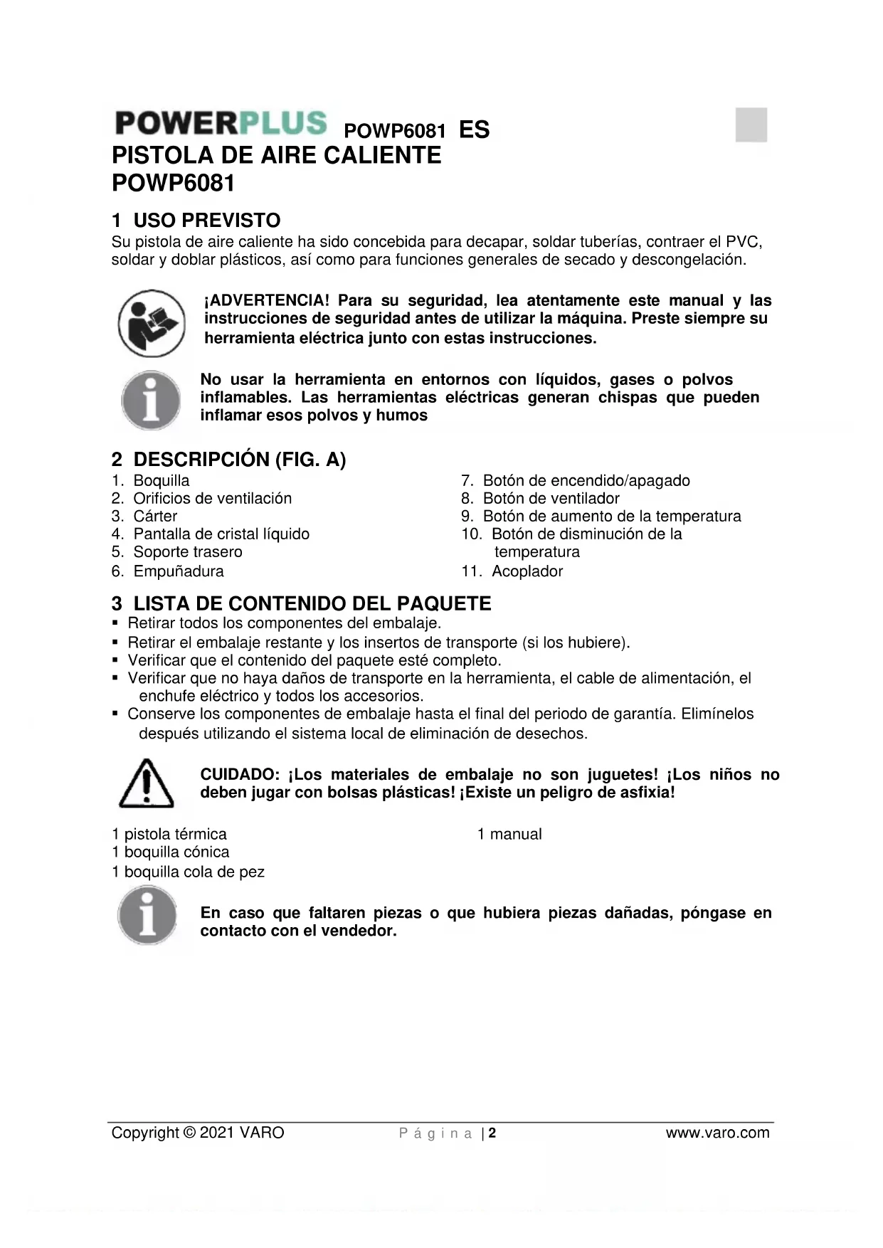 - Este aparato no puede ser utilizado por niños o personas debilitadas física o mentalmente, o afectadas desde el punto de vista de su desarrollo, ni por personas que carezcan de experiencia o conocimientos, excepto en caso de que recibieren una formación de parte de una persona responsable de su seguridad, un supervisor, o que estudiaren las anteriores instrucciones relativas al uso de este aparato.POWP6081 ES Copyright © 2021 VARO P á g i n a | 5 www.varo.com