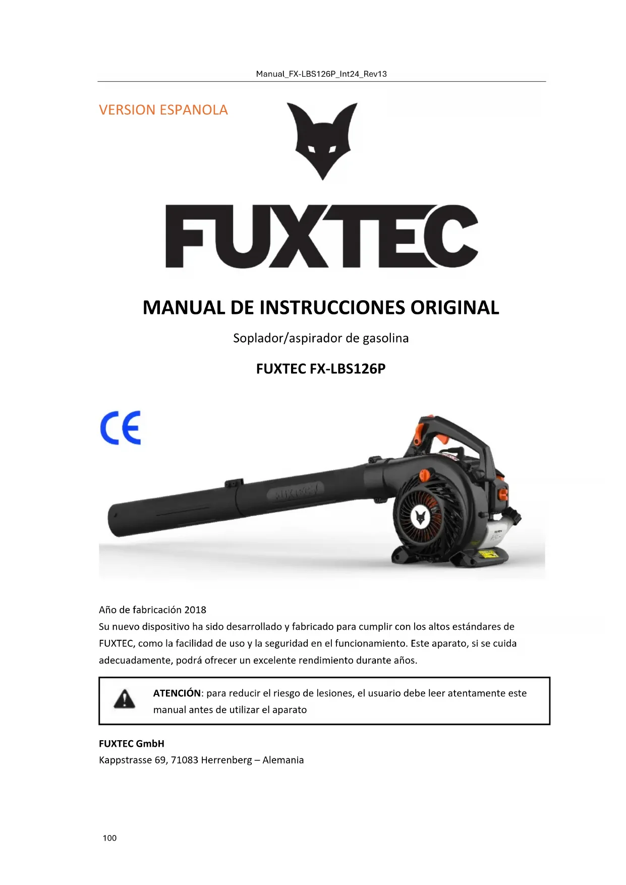 Año de fabricación 2018 Su nuevo dispositivo ha sido desarrollado y fabricado para cumplir con los altos estándares de FUXTEC, como la facilidad de uso y la seguridad en el funcionamiento. Este aparato, si se cuida adecuadamente, podrá ofrecer un excelente rendimiento durante años. ATENCIÓN: para reducir el riesgo de lesiones, el usuario debe leer atentamente este manual antes de utilizar el aparato FUXTEC GmbH Kappstrasse 69, 71083 Herrenberg – AlemaniaManual_FX-LBS126P_Int24_Rev13