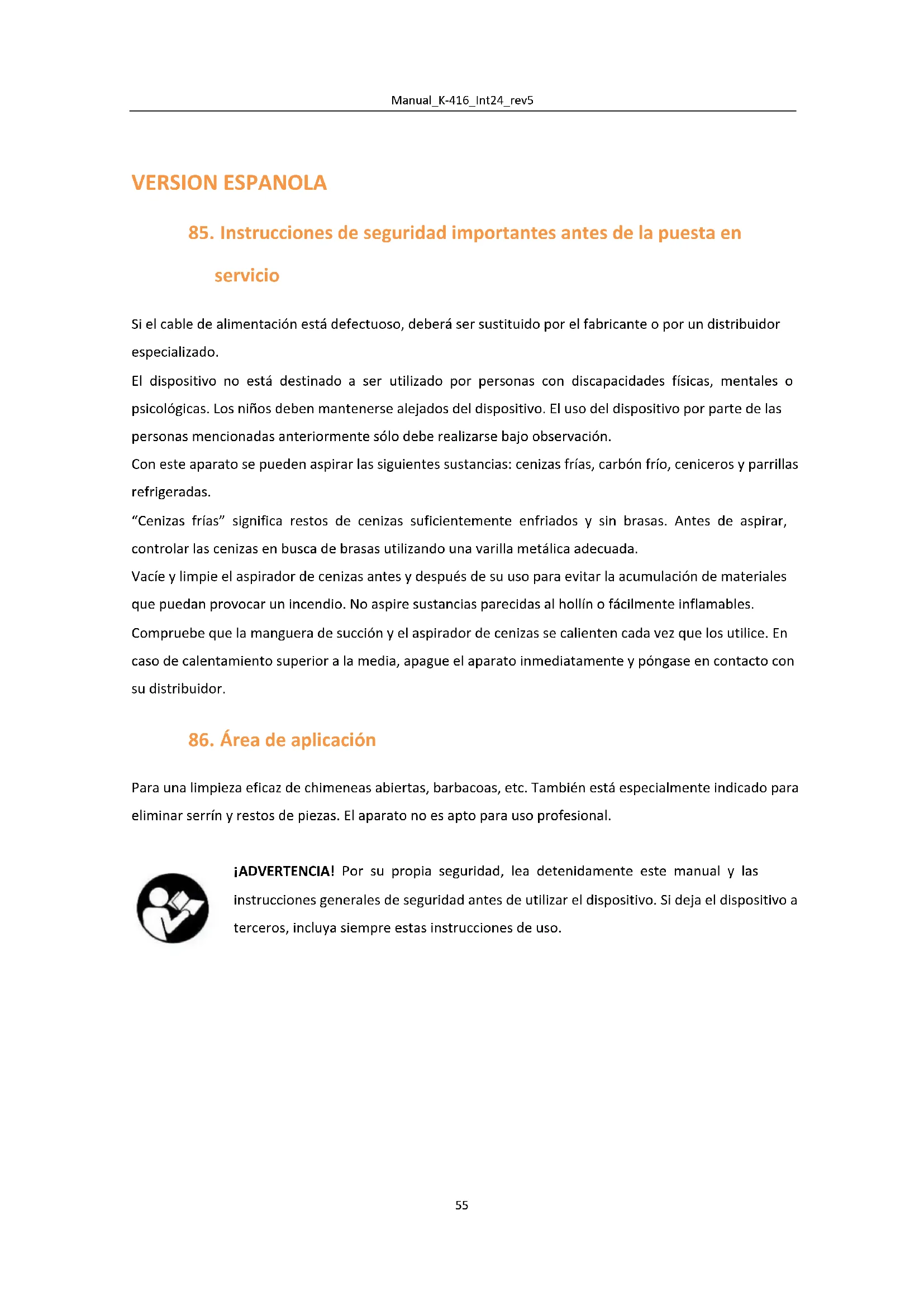 Para una limpieza eficaz de chimeneas abiertas, barbacoas, etc. También está especialmente indicado para eliminar serrín y restos de piezas. El aparato no es apto para uso profesional. ¡ADVERTENCIA! Por su propia seguridad, lea detenidamente este manual y las instrucciones generales de seguridad antes de utilizar el dispositivo. Si deja el dispositivo a terceros, incluya siempre estas instrucciones de uso.Manual_K-416_Int24_rev5