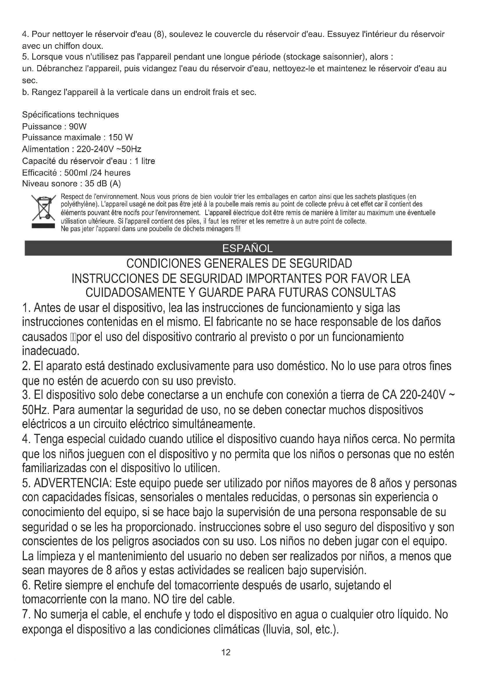 una. Desenchufe el dispositivo, luego drene el agua del tanque de agua, límpielo y mantenga el tanque de agua seco. b. Guarde el dispositivo en posición vertical en un lugar fresco y seco. Especificación técnica Potencia: 90W Potencia máxima: 150W Fuente de alimentación: 220-240V ~50Hz Capacidad del depósito de agua: 1 litro Eficiencia: 500ml /24 horas Nivel de ruido: 35dB (A) Preocupación por el medio ambiente. Por favor, lleva las cajas de cartón a un sitio de reciclaje. Las bolsas de polietileno se deben tirar al cubo de la basura amarillo (para envases). El equipo gastado debe ser entregado en el punto de almacenamiento adecuado, porque las piezas que constituyen el equipo pueden suponer un peligro para el medio ambiente. Debes entregar el equipo Hay que devolver el equipo eléctrico con el fin de evitar su reutilización. Si en el equipo se encuentran pilas, hay que sacarlas y entregar por separado, en un punto de almacenamiento adecuado. No tires el equipo al contenedor para residuos urbanos!! PORTUGUÊS