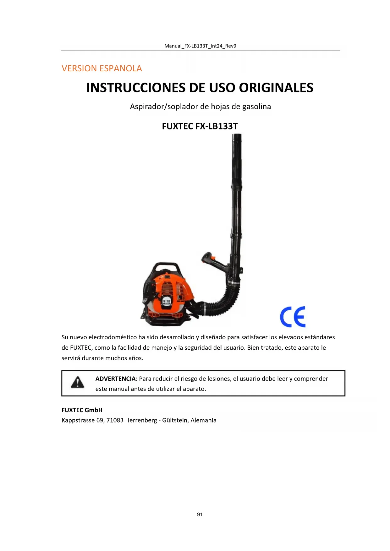 - No repare la máquina usted mismo. No realice ninguna reparación en la máquina que no esté descrita en el capítulo "Mantenimiento", sino póngase en contacto directamente con el servicio de atención al cliente de FUXTEC GmbH. Las reparaciones de otras piezas de la máquina deben ser realizadas por FUXTEC GmbH. Utilice únicamente piezas de repuesto originales. El uso de otras piezas de recambio o accesorios puede suponer un peligro para el usuario. FUXTEC GmbH no se hace responsable de los daños resultantes.Manual_FX-LB133T_Int24_Rev9