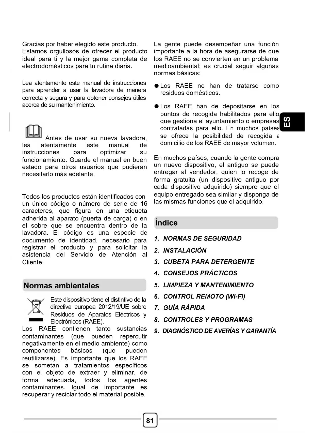 Lea atentamente este manual de instrucciones para aprender a usar la lavadora de manera correcta y segura y para obtener consejos útiles acerca de su mantenimiento.
