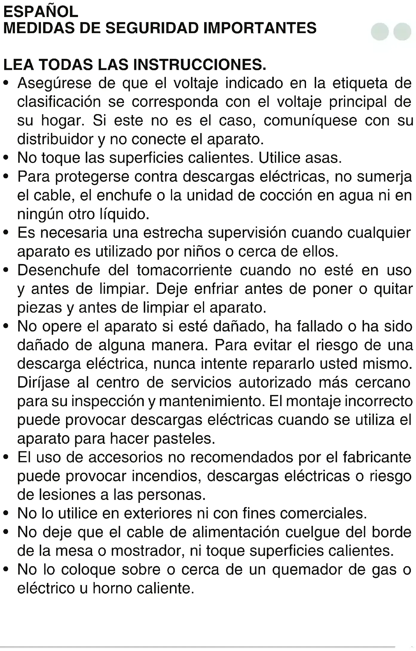 - Al utilizar equipos eléctricos, siempre se deben tomar precauciones de seguridad para evitar riesgos de incendio, descargas eléctricas y/o lesiones en caso de uso indebido.