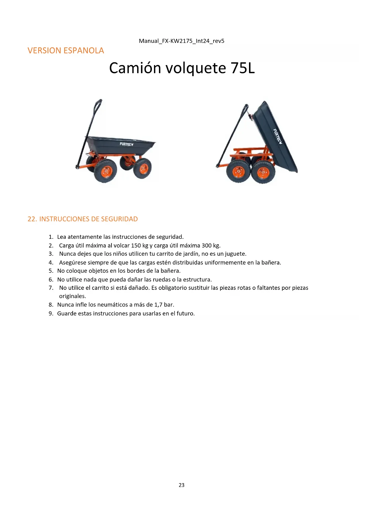 La carga útil en vuelco no supera los 150 kg y la carga útil máxima 300 kg.Manual_FX-KW2175_Int24_rev5