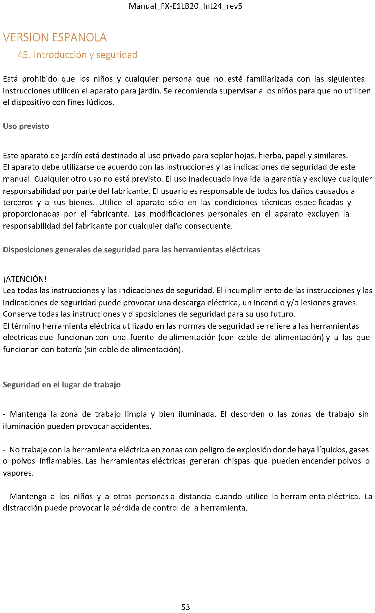 Disposiciones generales de seguridad - Por su propia seguridad y la de los demás, lea este manual y las instrucciones de seguridad pertinentes antes de utilizar el aparato. Conserve este manual y sus instrucciones de seguridad para su uso futuro, y téngalos siempre a mano. - En caso de cambio de propietario, adjunte el manual de instrucciones al dispositivo. - Las personas que utilicen el dispositivo no deben estar bajo la influencia de drogas (por ejemplo, alcohol, drogas o medicamentos). - Utilice el dispositivo de acuerdo con las condiciones técnicas prescritas y proporcionadas por el fabricante. Las modificaciones personales en el dispositivo excluyen la responsabilidad del fabricante por cualquier daño consecuente. - Utilice el aparato sólo con luz diurna o con una buena iluminación artificial. - Utilice el aparato sólo en condiciones de ausencia de humedad. Manténgalo alejado de la lluvia o la humedad. La filtración de agua en el aparato aumenta el riesgo de descarga eléctrica. - Apague el dispositivo y retire la batería cuando se produzcan los siguientes eventos: ⬧ si se deja el dispositivo sin vigilancia; ⬧ antes de revisar, limpiar o realizar cualquier otro trabajo en el dispositivo; ⬧ si el dispositivo comienza a vibrar excesivamente.Manual_FX-E1LB20_Int24_rev5