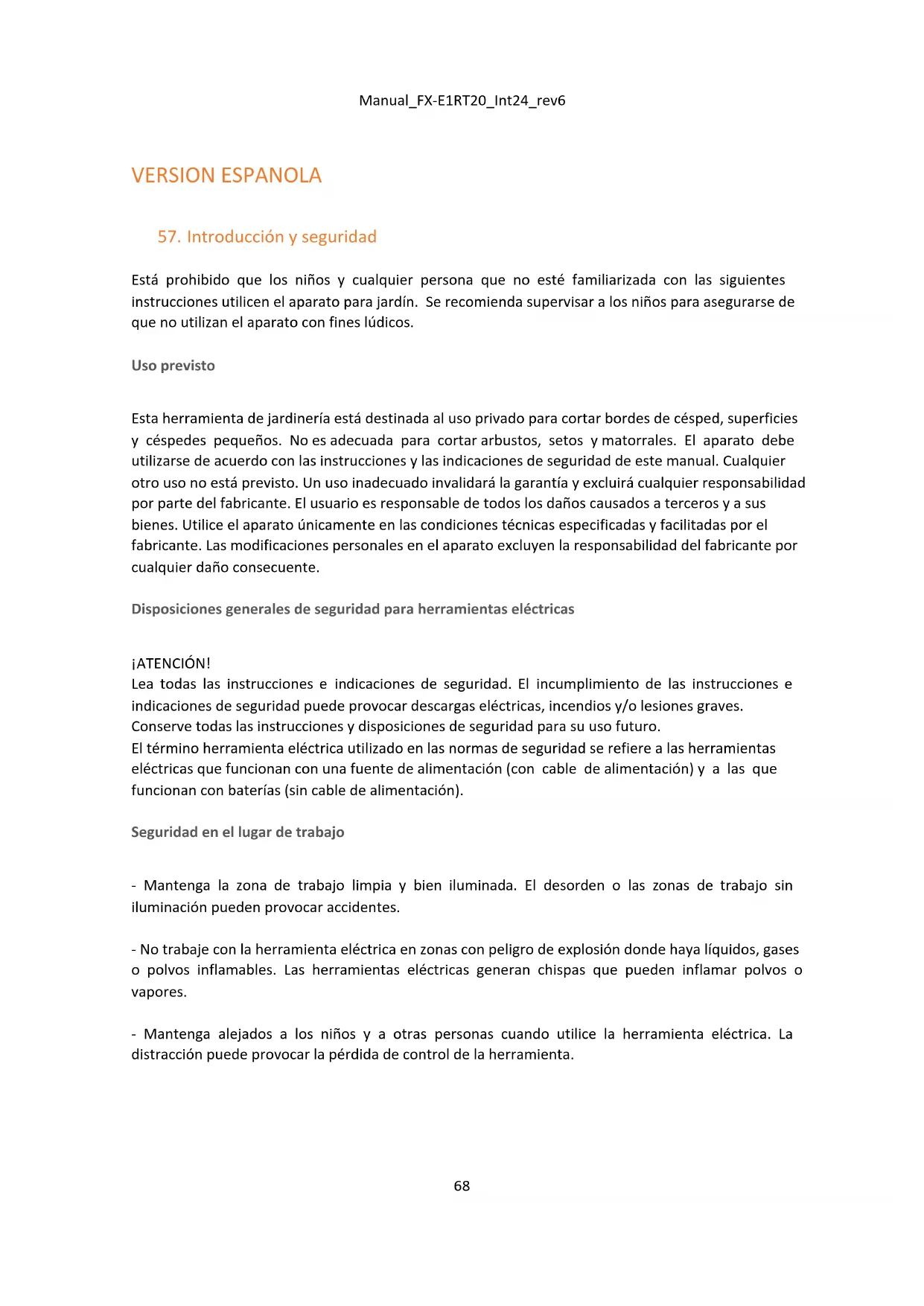Está prohibido que los niños y cualquier persona que no esté familiarizada con las siguientes instrucciones utilicen el aparato para jardín. Se recomienda supervisar a los niños para asegurarse de que no utilizan el aparato con fines lúdicos. Uso previsto Esta herramienta de jardinería está destinada al uso privado para cortar bordes de césped, superficies y céspedes pequeños. No es adecuada para cortar arbustos, setos y matorrales. El aparato debe utilizarse de acuerdo con las instrucciones y las indicaciones de seguridad de este manual. Cualquier otro uso no está previsto. Un uso inadecuado invalidará la garantía y excluirá cualquier responsabilidad por parte del fabricante. El usuario es responsable de todos los daños causados a terceros y a sus bienes. Utilice el aparato únicamente en las condiciones técnicas especificadas y facilitadas por el fabricante. Las modificaciones personales en el aparato excluyen la responsabilidad del fabricante por cualquier daño consecuente. Disposiciones generales de seguridad para herramientas eléctricas ¡ATENCIÓN! Lea todas las instrucciones e indicaciones de seguridad. El incumplimiento de las instrucciones e indicaciones de seguridad puede provocar descargas eléctricas, incendios y/o lesiones graves. Conserve todas las instrucciones y disposiciones de seguridad para su uso futuro. El término herramienta eléctrica utilizado en las normas de seguridad se refiere a las herramientas eléctricas que funcionan con una fuente de alimentación (con cable de alimentación) y a las que funcionan con baterías (sin cable de alimentación). Seguridad en el lugar de trabajo - Mantenga la zona de trabajo limpia y bien iluminada. El desorden o las zonas de trabajo sin iluminación pueden provocar accidentes. - No trabaje con la herramienta eléctrica en zonas con peligro de explosión donde haya líquidos, gases o polvos inflamables. Las herramientas eléctricas generan chispas que pueden inflamar polvos o vapores. - Mantenga alejados a los niños y a otras personas cuando utilice la herramienta eléctrica. La distracción puede provocar la pérdida de control de la herramienta.Manual_FX-E1RT20_Int24_rev6