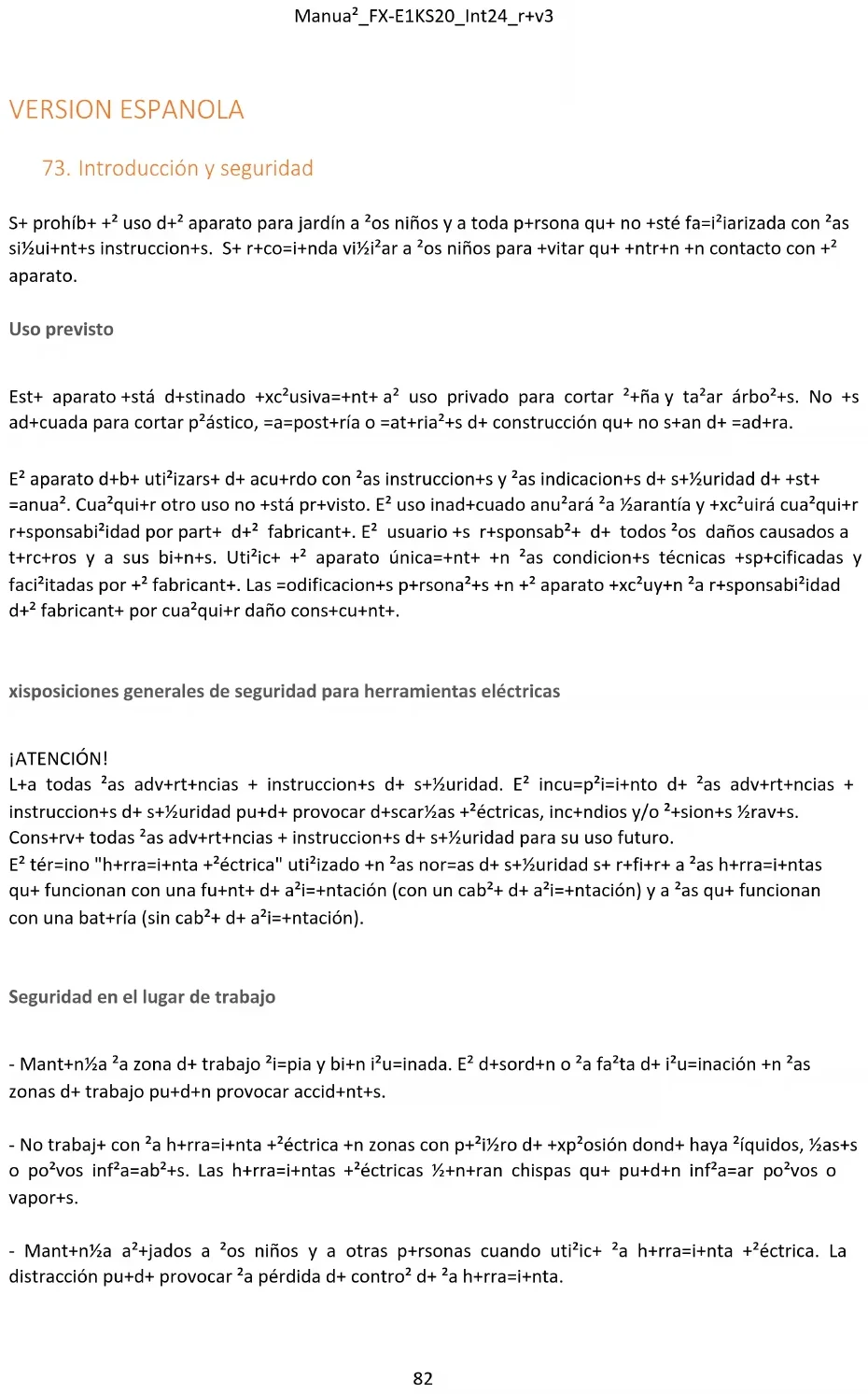 - Tenga especial cuidado al retroceder, ¡peligro de tropezar! - Proceda únicamente a paso de hombre. - No deje nunca el aparato desatendido durante las interrupciones del trabajo y guárdelo en un lugar seguro. - Mantenga todas las partes del cuerpo alejadas de la motosierra. No intente retirar o sujetar el material a cortar mientras la cadena esté en marcha. Retire el material atascado sólo con el aparato apagado. Un momento de falta de atención al utilizar la motosierra puede causar lesiones graves. - Transporte la motosierra por el asa y con el aparato apagado. Retire siempre la batería cuando transporte o guarde la unidad después de su uso. Manipular el aparato con cuidado reduce el riesgo de lesiones. - Guarde el aparato eléctrico en un lugar aislado, ya que la motosierra puede entrar en contacto con líneas eléctricas ocultas. Si la motosierra entra en contacto con una línea con corriente, pueden producirse descargas eléctricas. - Durante el proceso de corte, asegúrese de que no haya personas (especialmente niños) ni animales en la zona de trabajo. - Cuando la motosierra esté en funcionamiento, mantenga todas las partes del cuerpo alejadas de la cadena. Antes de arrancar la motosierra, asegúrese de que la cadena no toca otras superficies. Al utilizar una motosierra, un momento de falta de atención puede hacer que la ropa o partes del cuerpo queden atrapadas en la cadena. - Utilice gafas protectoras y tapones para los oídos. También se recomiendan otros equipos de protección para la cabeza, las manos, las piernas y los pies. Una ropa de protección adecuada reduce el riesgo de lesiones por astillas voladoras y contacto accidental con la cadena. - No utilice la motosierra en un árbol, existe riesgo de lesiones. - Utilice el aparato sólo en condiciones secas. Manténgalo alejado de la lluvia o la humedad. - Asegúrese siempre de mantener una posición estable y utilice la motosierra únicamente sobre suelo sólido, firme y nivelado. El suelo resbaladizo o las superficies inestables, como una escalera, pueden causar pérdida de equilibrio o pérdida de control de la motosierra. - Asegúrese de que la motosierra no entre en contacto con el suelo u otros objetos durante el funcionamiento. - Al cortar una rama tensada, preste mucha atención al rebote hacia atrás de la rama. Si se libera la tensión, la rama tensada puede golpear al operario y/o hacer que pierda el control de la motosierra. - Tenga especial cuidado al cortar la maleza y los árboles jóvenes. El material fino puede engancharse en la cadena y golpearte o hacerte perder el equilibrio.Manual_FX-E1KS20_Int24_rev3