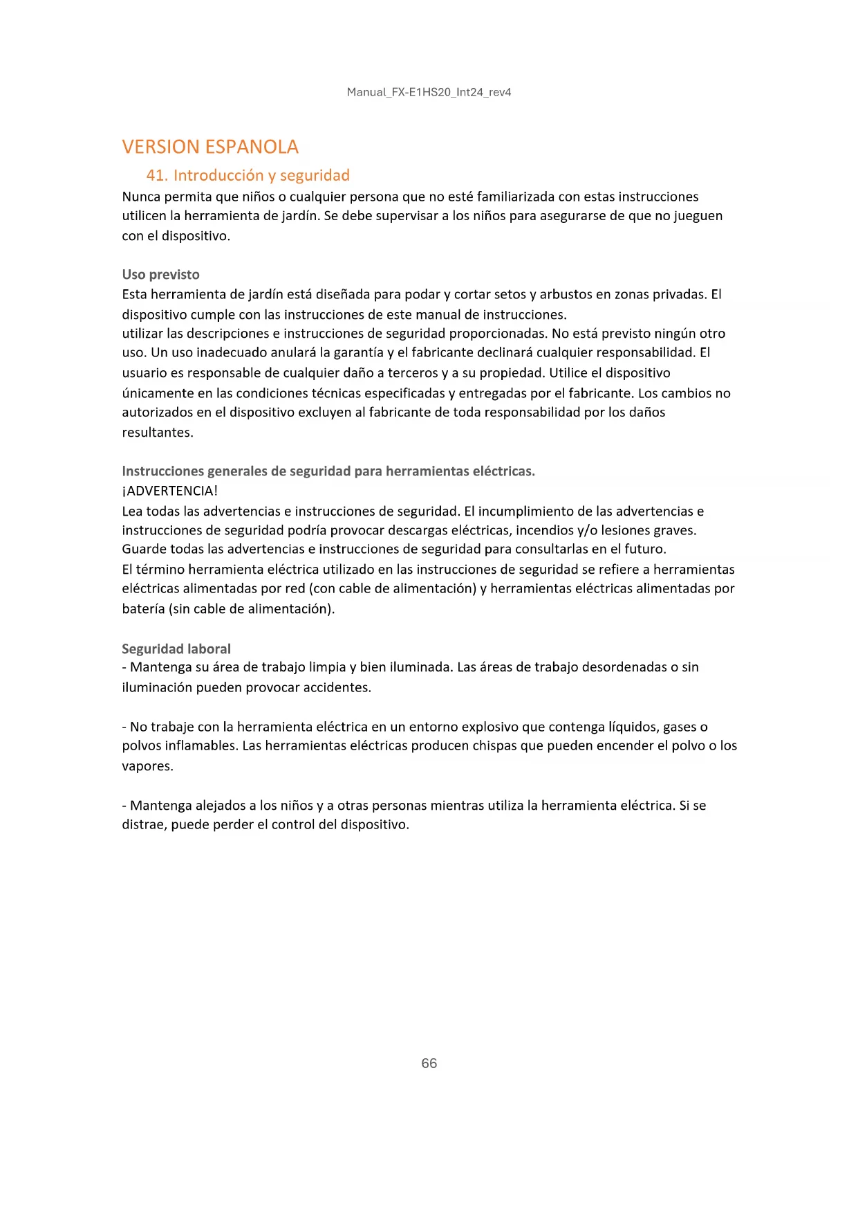 Nunca permita que niños o cualquier persona que no esté familiarizada con estas instrucciones utilicen la herramienta de jardín. Se debe supervisar a los niños para asegurarse de que no jueguen con el dispositivo. Uso previsto Esta herramienta de jardín está diseñada para podar y cortar setos y arbustos en zonas privadas. El dispositivo cumple con las instrucciones de este manual de instrucciones. utilizar las descripciones e instrucciones de seguridad proporcionadas. No está previsto ningún otro uso. Un uso inadecuado anulará la garantía y el fabricante declinará cualquier responsabilidad. El usuario es responsable de cualquier daño a terceros y a su propiedad. Utilice el dispositivo únicamente en las condiciones técnicas especificadas y entregadas por el fabricante. Los cambios no autorizados en el dispositivo excluyen al fabricante de toda responsabilidad por los daños resultantes. Instrucciones generales de seguridad para herramientas eléctricas. ¡ADVERTENCIA! Lea todas las advertencias e instrucciones de seguridad. El incumplimiento de las advertencias e instrucciones de seguridad podría provocar descargas eléctricas, incendios y/o lesiones graves. Guarde todas las advertencias e instrucciones de seguridad para consultarlas en el futuro. El término herramienta eléctrica utilizado en las instrucciones de seguridad se refiere a herramientas eléctricas alimentadas por red (con cable de alimentación) y herramientas eléctricas alimentadas por batería (sin cable de alimentación). Seguridad laboral - Mantenga su área de trabajo limpia y bien iluminada. Las áreas de trabajo desordenadas o sin iluminación pueden provocar accidentes. - No trabaje con la herramienta eléctrica en un entorno explosivo que contenga líquidos, gases o polvos inflamables. Las herramientas eléctricas producen chispas que pueden encender el polvo o los vapores. - Mantenga alejados a los niños y a otras personas mientras utiliza la herramienta eléctrica. Si se distrae, puede perder el control del dispositivo.Manual_FX-E1HS20_Int24_rev4