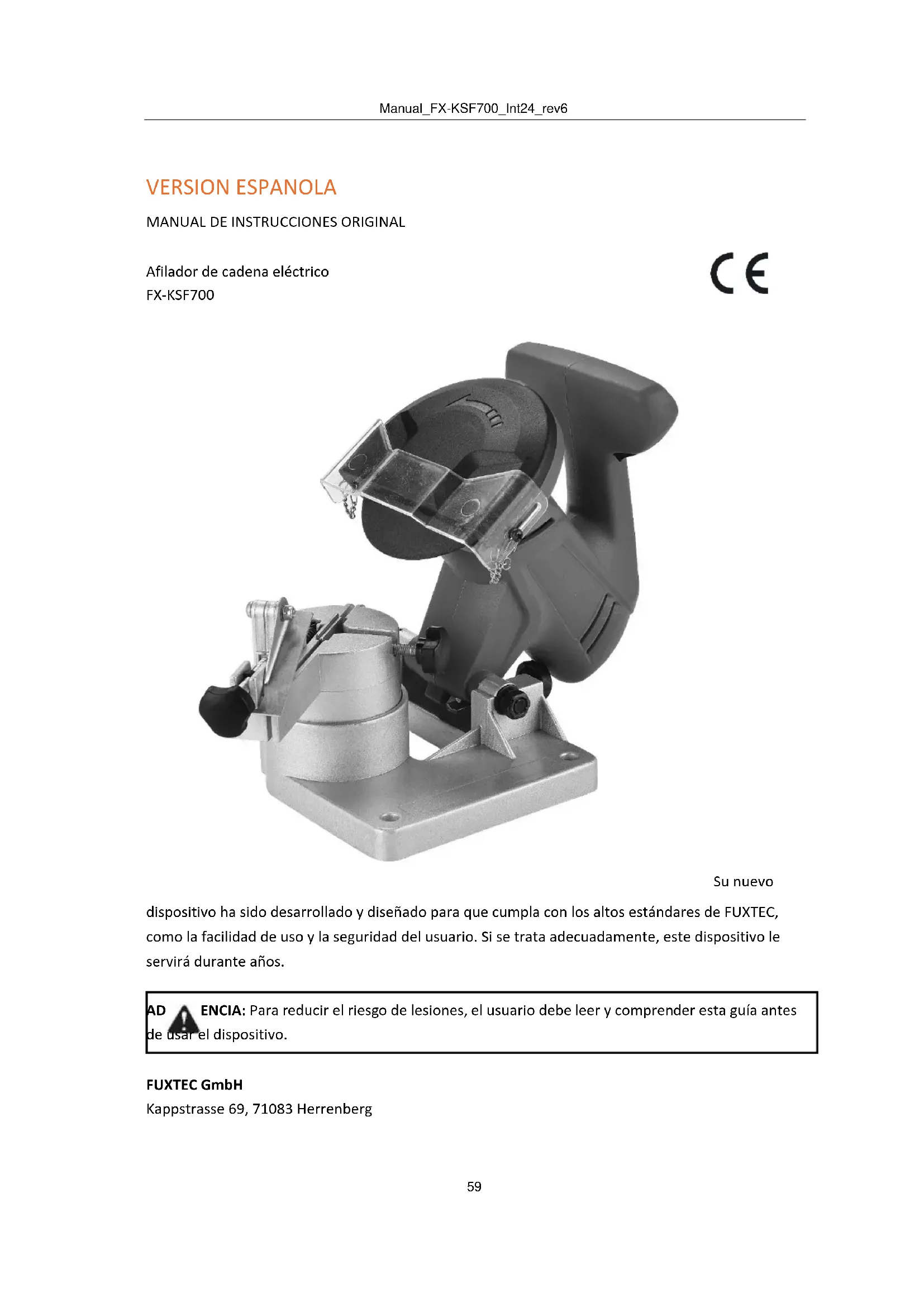 Afilador de cadena eléctrico FX-KSF700 Su nuevo dispositivo ha sido desarrollado y diseñado para que cumpla con los altos estándares de FUXTEC, como la facilidad de uso y la seguridad del usuario. Si se trata adecuadamente, este dispositivo le servirá durante años. ADVERTENCIA: Para reducir el riesgo de lesiones, el usuario debe leer y comprender esta guía antes de usar el dispositivo. FUXTEC GmbH Kappstrasse 69, 71083 HerrenbergManual_FX-KSF700_Int24_rev6