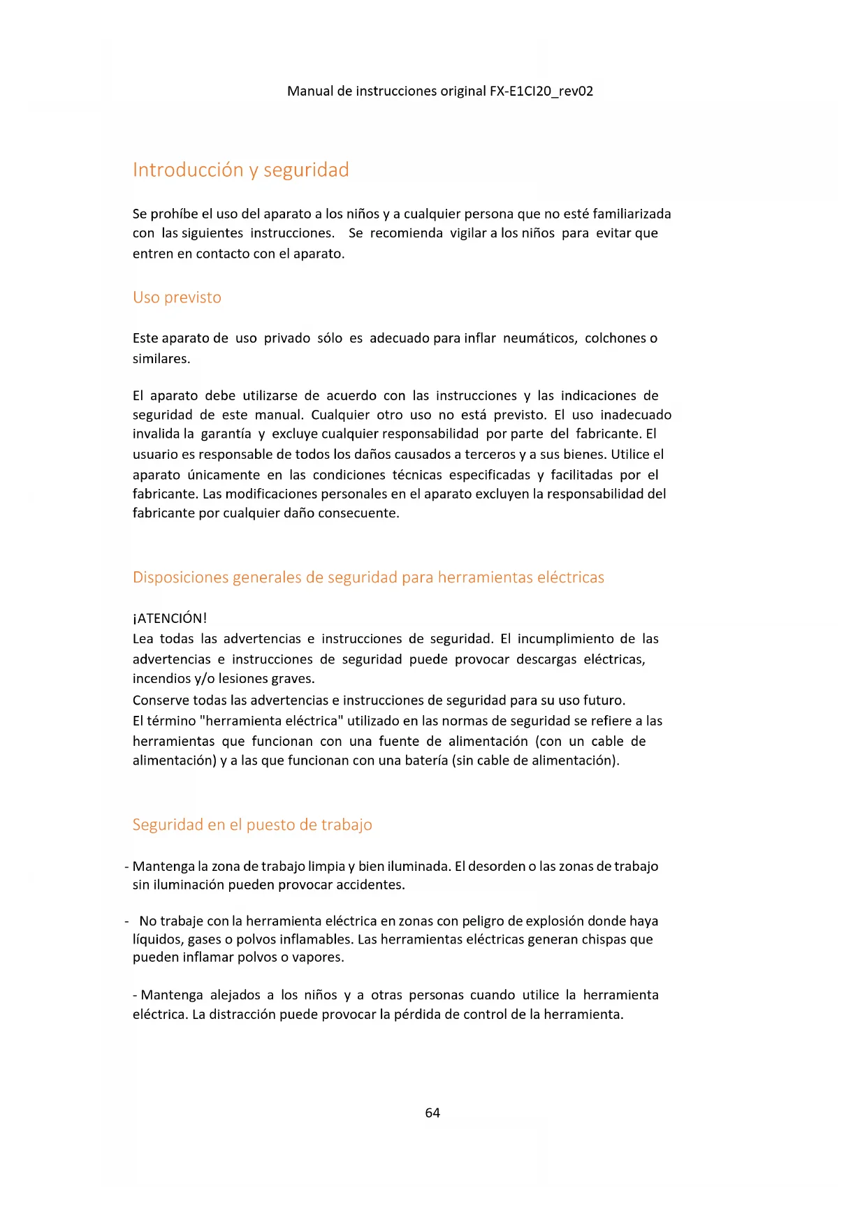 Disposiciones de seguridad para compresores alimentados por batería Disposiciones generales de seguridad - Por su propia seguridad y la de los demás, lea este manual y las instrucciones de seguridad pertinentes antes de utilizar el aparato. Conserve este manual y sus disposiciones de seguridad para usos futuros, y téngalos siempre a mano. - En caso de cambio de propietario, adjunte el manual de instrucciones al aparato. - Las personas que utilicen el dispositivo no deben estar bajo los efectos de drogas (por ejemplo, alcohol, drogas o medicamentos). - Utilice el aparato de acuerdo con las condiciones técnicas prescritas y facilitadas por el fabricante. Las modificaciones personales en el aparato excluyen la responsabilidad del fabricante por cualquier daño consecuente. - Utilice el aparato sólo a la luz del día o con buena iluminación artificial. - Utilice el aparato sólo en condiciones secas. Manténgalo alejado de la lluvia o la humedad. La penetración de agua en el aparato aumenta el riesgo de descarga eléctrica. - Apague el dispositivo y retire la batería cuando se produzcan los siguientes eventos: ⬧ si el dispositivo se deja desatendido;68 Manual de instrucciones original FX-E1CI20_rev02