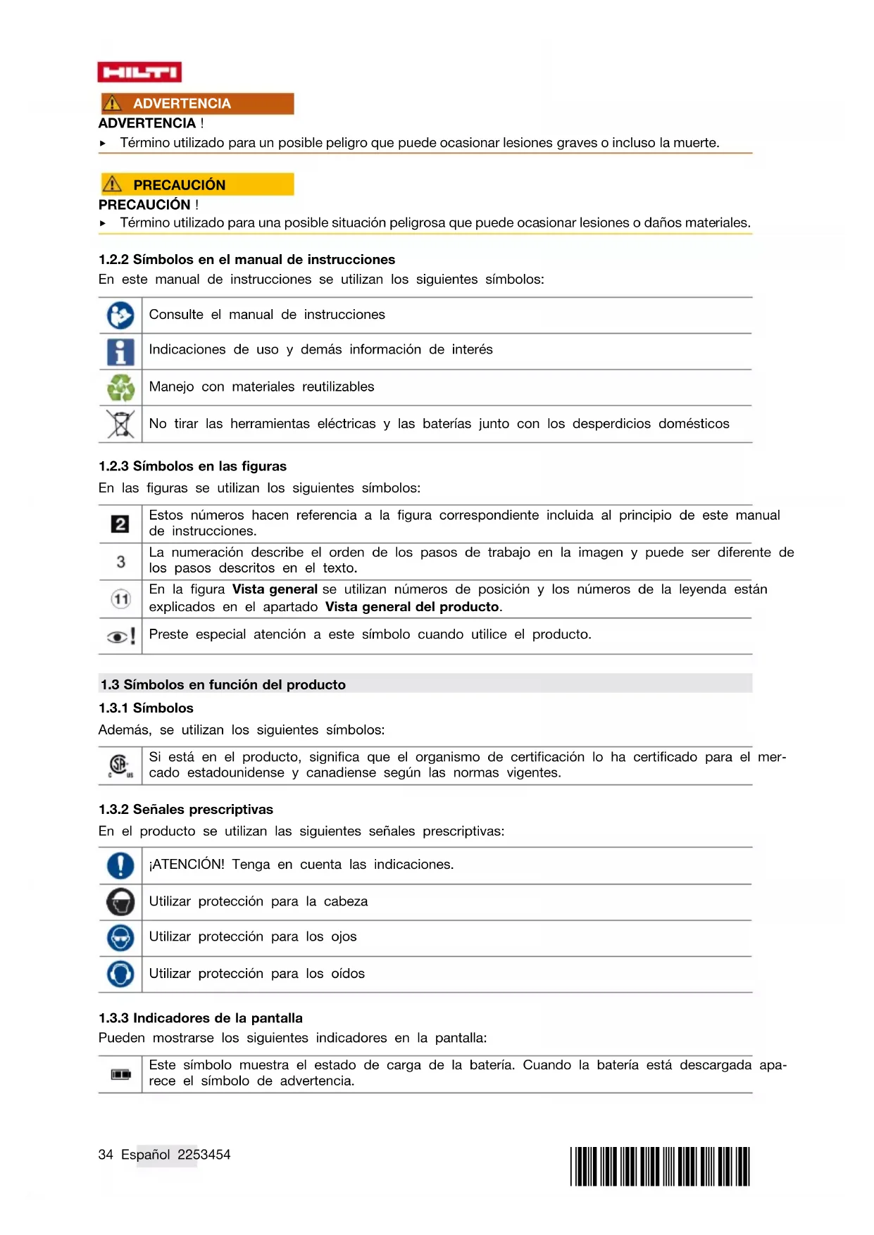 Pueden mostrarse los siguientes indicadores en la pantalla: Este símbolo muestra el estado de carga de la batería. Cuando la batería está descargada apa- rece el símbolo de advertencia.*2253454* 2253454 Español 35 El símbolo de advertencia indica que debe llevarse a cabo el mantenimiento. Aparece tras 5 años, 30000 fijaciones o cuando la batería está descargada. Nuestra recomendación: Diríjase a su Servicio Técnico de Hilti. El contador de fijaciones indica cuándo está previsto el siguiente servicio de mantenimiento. Para ello, se muestra un segmento que incluye 500 fijaciones. En total hay 5 segmentos, que equivalen a 2500 fijaciones. Este símbolo indica si el Bluetooth está conectado. Si el símbolo no aparece en la pantalla, significa que el Bluetooth está desconectado.