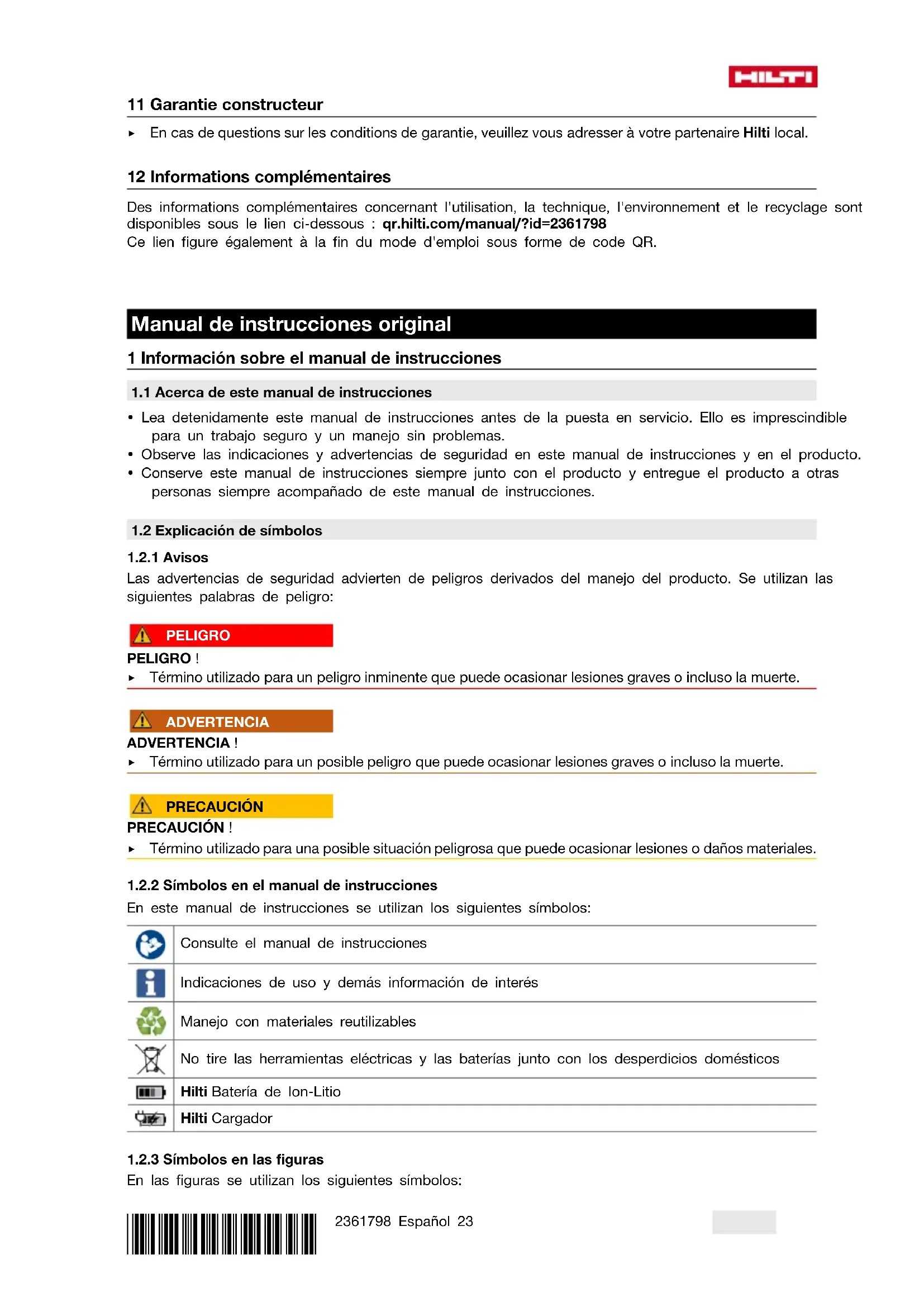- Retire los restos de hormigón parcialmente secos introduciendo el cuerpo vibratorio en grava y dejándolo funcionar brevemente. 8 Transporte y almacenamiento Transporte de baterías y herramientas a batería PRECAUCIÓN Arranque involuntario en el transporte ! ▶ Transporte sus productos siempre sin batería. ▶ Extraiga la(s) batería(s). ▶ Nunca transporte las baterías sin embalaje. Durante el transporte, las baterías deben estar protegidas frente a vibraciones y golpes excesivos y aisladas de todo material conductor y de otras baterías para que no entren en contacto con los polos de otras baterías y causen un cortocircuito. Tenga en cuenta las normativas locales sobre el transporte de baterías. ▶ Las baterías no deben enviarse por correo. Diríjase a una empresa de transporte si quiere enviar baterías no dañadas. ▶ Compruebe si el producto o las baterías están dañados antes de cada uso y antes y después de un transporte prolongado. Almacenamiento de baterías y herramientas a batería ADVERTENCIA Daños imprevistos debido a una batería defectuosa o agotada ! ▶ Guarde su productos siempre sin batería. ▶ Guarde el producto y las baterías en un lugar fresco y seco. Tenga en cuenta los valores límite de temperatura que figuran en los datos técnicos.34 Português 2361798 *2361798* ▶ No almacene las baterías en el cargador. Extraiga siempre la batería del cargador después del proceso de carga. ▶ No guarde nunca las baterías en un lugar expuesto al sol, a fuentes de calor o detrás de un cristal. ▶ Guarde el producto y las baterías fuera del alcance de niños y personas no autorizadas. ▶ Compruebe si el producto o las baterías están dañados antes de cada uso y antes y después de un almacenamiento prolongado. 9 Ayuda en caso de averías En caso de producirse cualquier avería, compruebe el indicador del estado de carga y de averías de la batería. Véase el capítulo Mostrar la batería de Ion-Litio. Si se producen averías que no estén incluidas en esta tabla o que no pueda solucionar usted mismo, diríjase al Servicio Técnico de Hilti. Anomalía Posible causa Solución La batería no se enclava con un «clic» audible. Las lengüetas de la batería están sucias. ▶ Limpie la lengüeta y vuelva a colocar la batería. 10 Reciclaje ADVERTENCIA Riesgo de lesiones por un reciclaje indebido. Riesgo para la salud debido a escapes de gases o líquidos. ▶ No envíe baterías dañadas bajo ningún concepto. ▶ Cubra las conexiones con un material no conductor para evitar cortocircuitos. ▶ Deshágase de las baterías de tal forma que no terminen en manos de niños. ▶ Elimine la batería en su Hilti Store o diríjase a su empresa de desechos. Los productos Hilti están fabricados en su mayor parte con materiales reutilizables. La condición para dicha reutilización es una separación adecuada de los materiales. En muchos países, Hilti recoge las herramientas usadas para su recuperación. Pregunte al Servicio de Atención al Cliente de Hilti o a su asesor de ventas. ▶ No deseche las herramientas eléctricas, los aparatos eléctricos ni las baterías junto con los residuos domésticos. 11 Garantía del fabricante ▶ Si tiene alguna consulta acerca de las condiciones de la garantía, póngase en contacto con su sucursal local de Hilti. 12 Más información Encontrará información adicional sobre manejo, técnica, medioambiente y reciclaje en el siguiente enlace: qr.hilti.com/manual/?id=2361798 Encontrará este enlace también al final del manual de instrucciones como código QR. Manual de instruções original 1 Indicações sobre o Manual de instruções