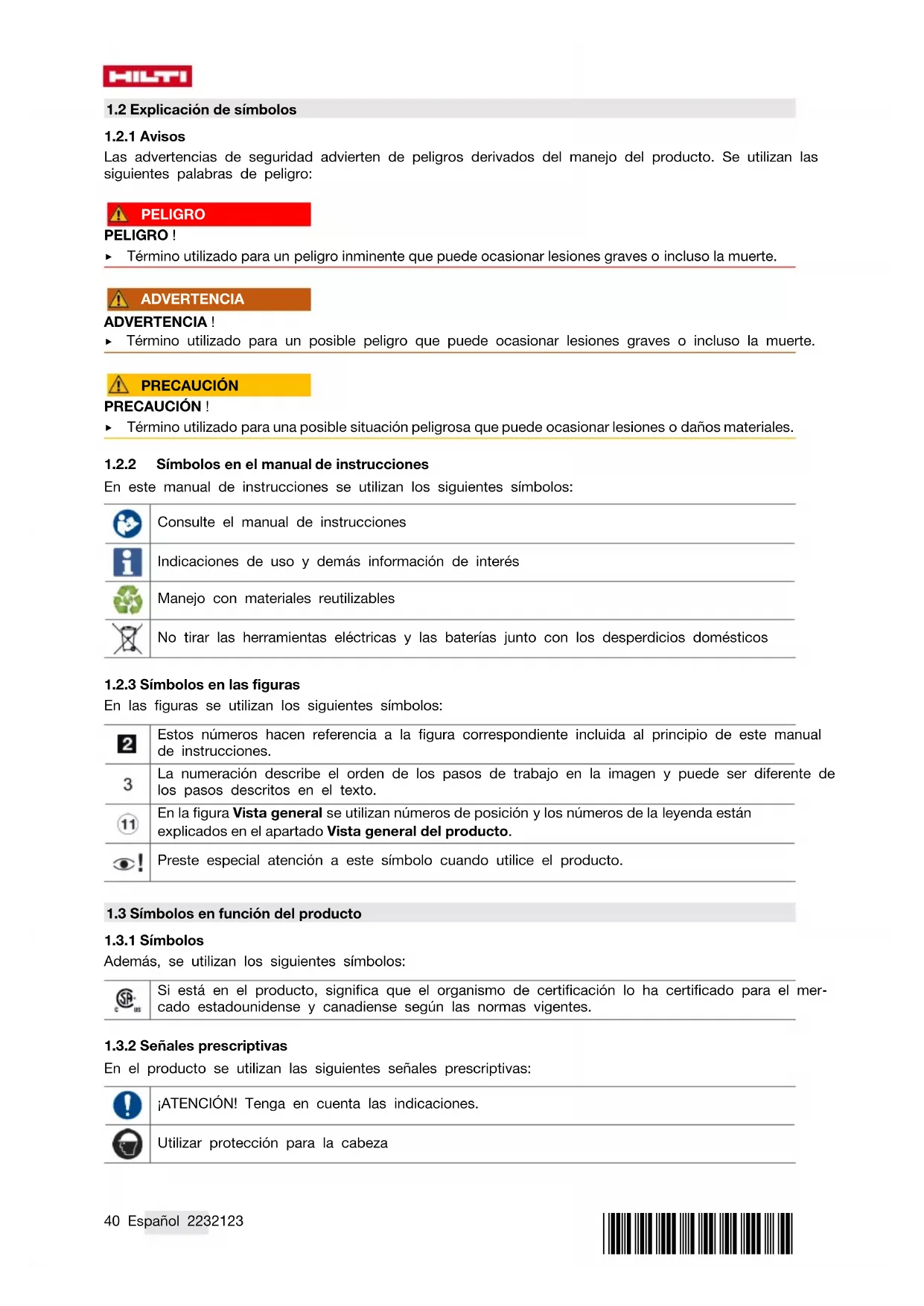 Indicaciones básicas de seguridad ¡ADVERTENCIA! Lea con atención todas las instrucciones e indicaciones de seguridad. Si no se respetan las instrucciones e indicaciones de seguridad, pueden producirse lesiones de gravedad. Conserve todas las instrucciones e indicaciones de seguridad para futuras consultas. ▶ No efectúe manipulaciones o modificaciones en la fijadora. ▶ Utilice siempre fijadoras, equipamientos (bases, guías de clavos, cargadores, pistones y accesorios) y consumibles (elementos de fijación y cartuchos) compatibles entre sí. ▶ Compruebe que la fijadora y los accesorios no presentan daños. ▶ Los componentes móviles deben funcionar correctamente y no estar atascados. Tenga en cuenta las indicaciones de este manual de instrucciones acerca de la limpieza y la lubricación → página 53. ▶ Para garantizar un correcto funcionamiento de la fijadora, todos los componentes deben estar correctamente montados. Las piezas dañadas deben repararse o sustituirse de forma pertinente por el Servicio Técnico de Hilti si no se especifica lo contrario en el manual de instrucciones. ▶ Emplee exclusivamente cartuchos Hilti DX u otros cartuchos adecuados que cumplan con los requisitos mínimos de seguridad. → página 4642 Español 2232123 *2232123* ▶ Utilice la fijadora exclusivamente para las aplicaciones definidas en el apartado relativo al uso debido