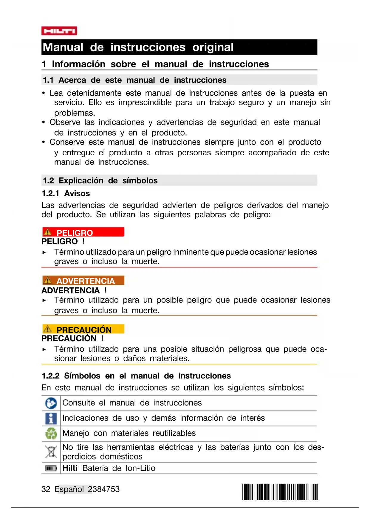 En este manual de instrucciones se utilizan los siguientes símbolos: Consulte el manual de instrucciones Indicaciones de uso y demás información de interés Manejo con materiales reutilizables No tire las herramientas eléctricas y las baterías junto con los des- perdicios domésticos Hilti Batería de Ion-Litio*2384753* 2384753 Español 33 Hilti Cargador