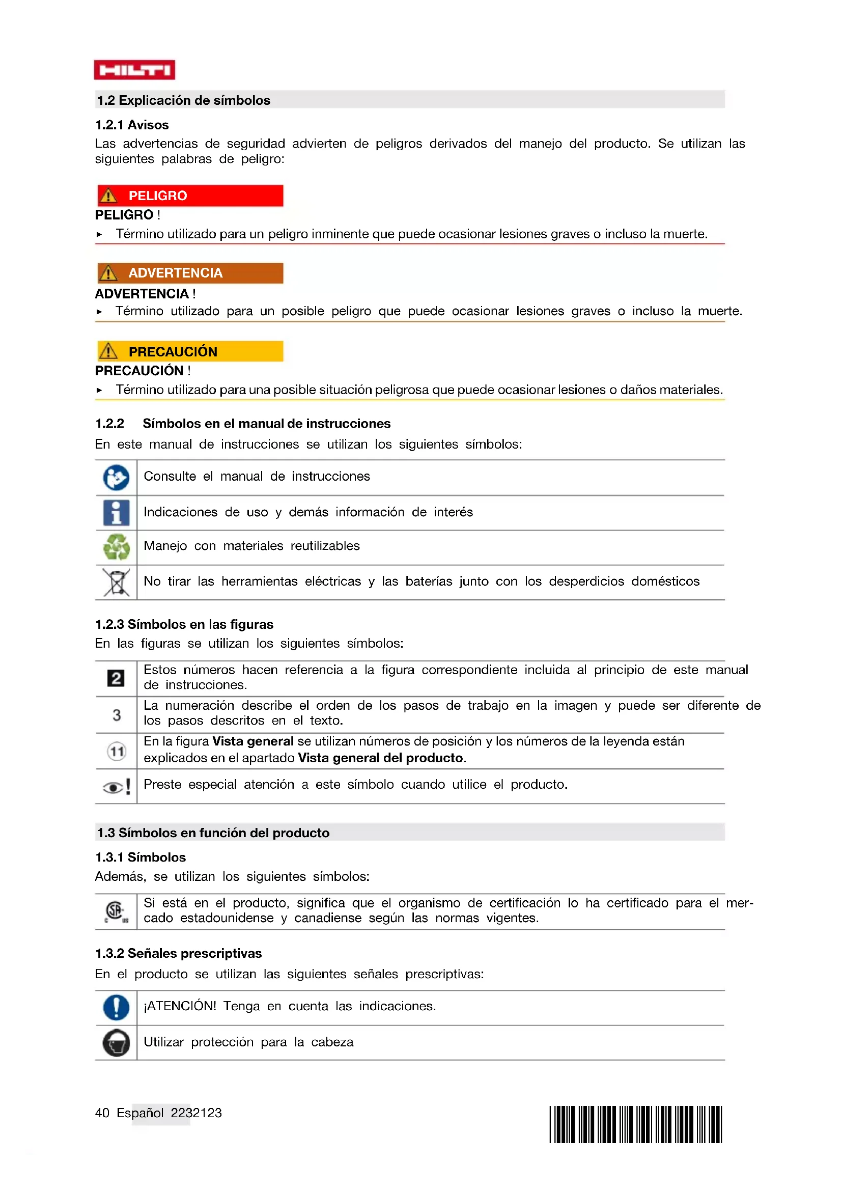 Indicaciones básicas de seguridad ¡ADVERTENCIA! Lea con atención todas las instrucciones e indicaciones de seguridad. Si no se respetan las instrucciones e indicaciones de seguridad, pueden producirse lesiones de gravedad. Conserve todas las instrucciones e indicaciones de seguridad para futuras consultas. ▶ No efectúe manipulaciones o modificaciones en la fijadora. ▶ Utilice siempre fijadoras, equipamientos (bases, guías de clavos, cargadores, pistones y accesorios) y consumibles (elementos de fijación y cartuchos) compatibles entre sí. ▶ Compruebe que la fijadora y los accesorios no presentan daños. ▶ Los componentes móviles deben funcionar correctamente y no estar atascados. Tenga en cuenta las indicaciones de este manual de instrucciones acerca de la limpieza y la lubricación → página 53. ▶ Para garantizar un correcto funcionamiento de la fijadora, todos los componentes deben estar correctamente montados. Las piezas dañadas deben repararse o sustituirse de forma pertinente por el Servicio Técnico de Hilti si no se especifica lo contrario en el manual de instrucciones. ▶ Emplee exclusivamente cartuchos Hilti DX u otros cartuchos adecuados que cumplan con los requisitos mínimos de seguridad. → página 4642 Español 2232123 *2232123* ▶ Utilice la fijadora exclusivamente para las aplicaciones definidas en el apartado relativo al uso debido