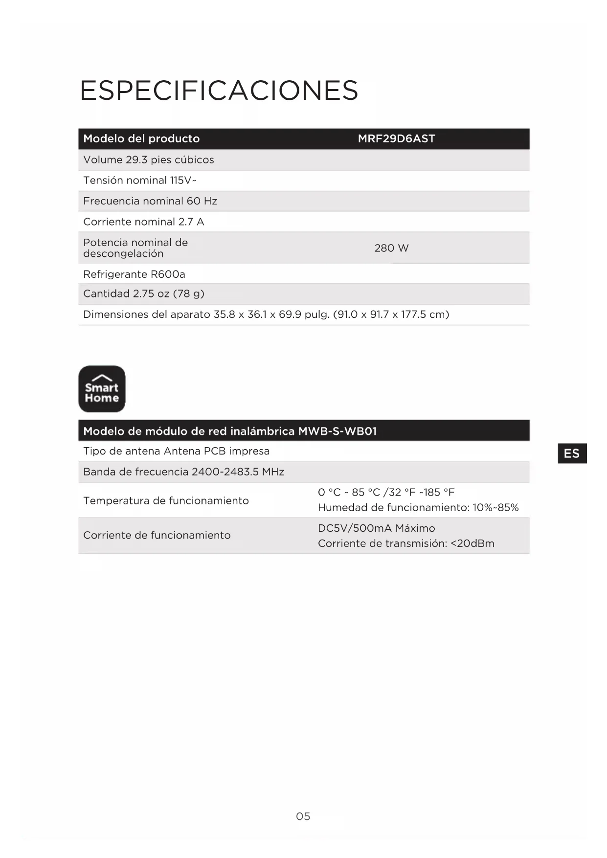 Volume 29.3 pies cúbicos Tensión nominal 115V~ Frecuencia nominal 60 Hz Corriente nominal 2.7 A Potencia nominal de descongelación 280 W Refrigerante R600a Cantidad 2.75 oz (78 g) Dimensiones del aparato 35.8 x 36.1 x 69.9 pulg. (91.0 x 91.7 x 177.5 cm) Modelo de módulo de red inalámbrica MWB-S-WB01 Tipo de antena Antena PCB impresa Banda de frecuencia 2400-2483.5 MHz Temperatura de funcionamiento 0 °C ~ 85 °C /32 °F ~185 °F Humedad de funcionamiento: 10%~85% Corriente de funcionamiento DC5V/500mA Máximo Corriente de transmisión: <20dBm06