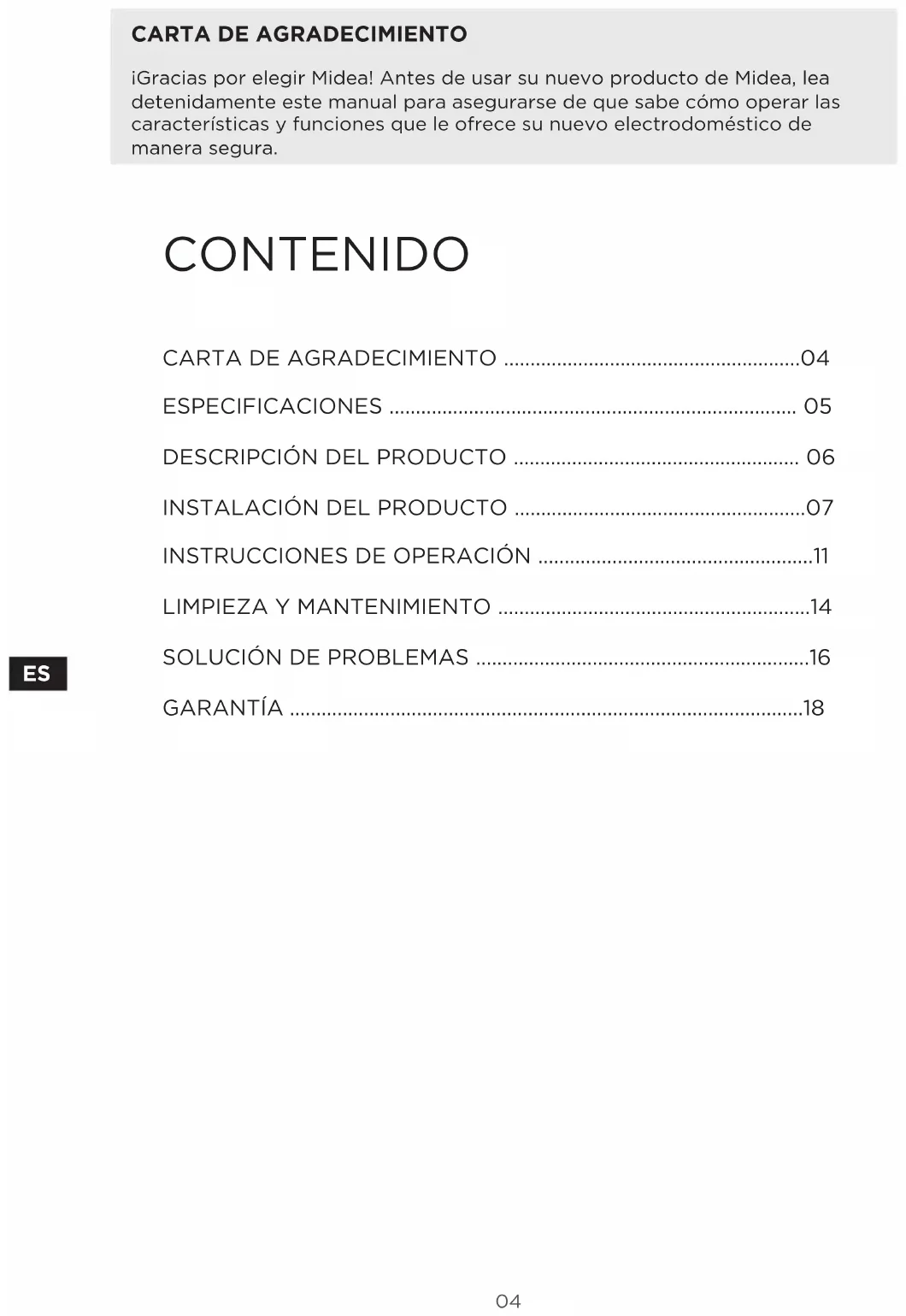 ¡Gracias por elegir Midea! Antes de usar su nuevo producto de Midea, lea detenidamente este manual para asegurarse de que sabe cómo operar las características y funciones que le ofrece su nuevo electrodoméstico de manera segura. CONTENIDO