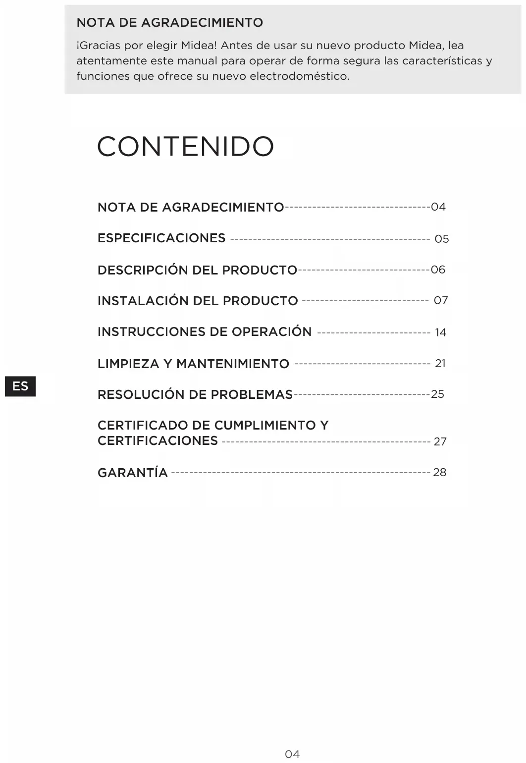 ¡Gracias por elegir Midea! Antes de usar su nuevo producto Midea, lea atentamente este manual para operar de forma segura las características y funciones que ofrece su nuevo electrodoméstico. CONTENIDO