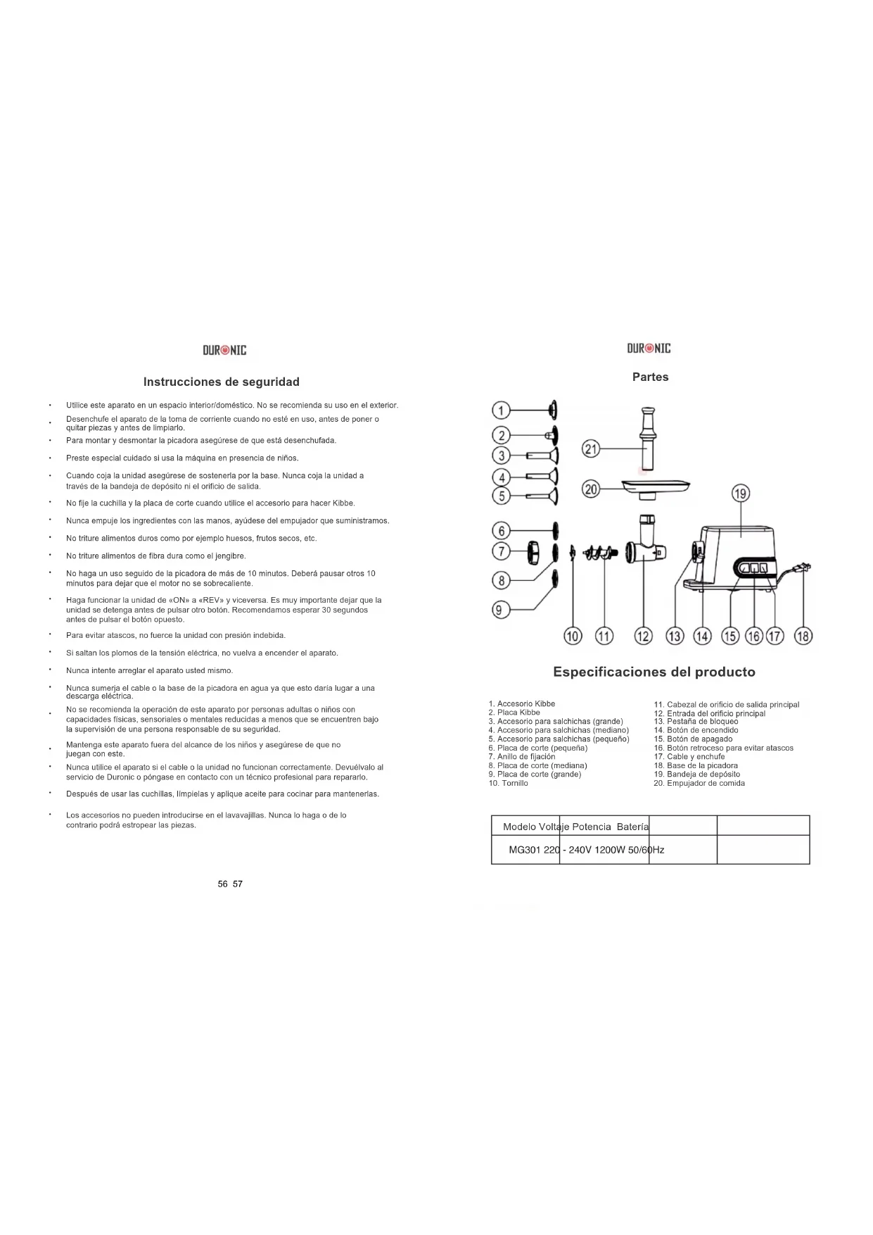 MG301 - Hachoir Duronic - Manual de uso y guía de instrucciones gratis