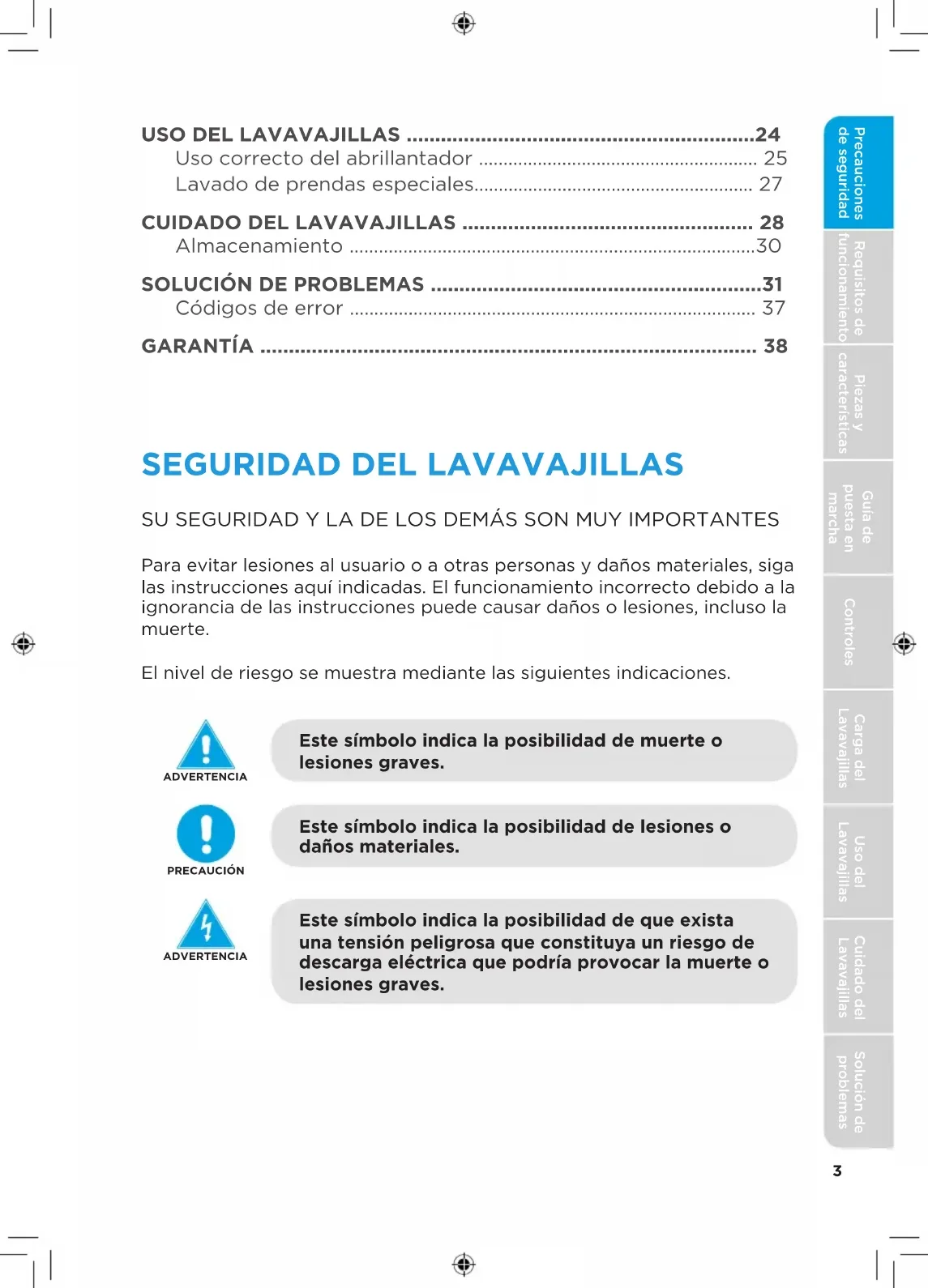 bandeja.31 Precauciones de seguridad Requisitos de funcionamiento Piezas y características Guía de puesta en marcha Controles Carga del Lavavajillas Uso del Lavavajillas Cuidado del Lavavajillas Solución de problemas