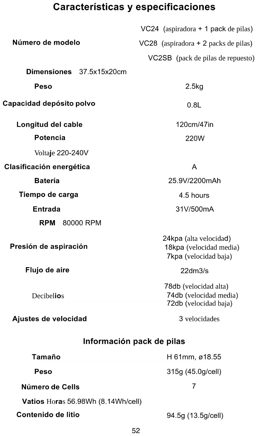 l52 Características y especificaciones VC24 (aspiradora + 1 pack de pilas) VC28 (aspiradora + 2 packs de pilas) VC2SB (pack de pilas de repuesto) Dimensiones 37.5x15x20cm 2.5kg Capacidad depósito 0.8L 120cm/47in 220W Voltaje 220-240V