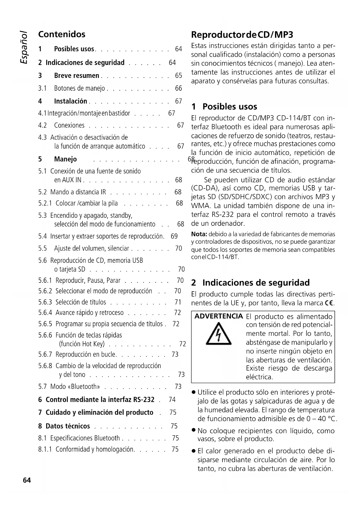 Español Reproductor de CD / MP3 Estas instrucciones están dirigidas tanto a per- sonal cualificado (instalación) como a personas sin conocimientos técnicos ( manejo). Lea aten- tamente las instrucciones antes de utilizar el aparato y consérvelas para futuras consultas. 1 Posibles usos El reproductor de CD / MP3 CD-114 / BT con in- terfaz Bluetooth es ideal para numerosas apli- caciones de refuerzo de sonido (teatros, restau- rantes, etc.) y ofrece muchas prestaciones como la función de inicio automático, repetición de reproducción, función de afinación, programa- ción de una secuencia de títulos. Se pueden utilizar CD de audio estándar (CD-DA), así como CD, memorias USB y tar- jetas SD (SD / SDHC / SDXC) con archivos MP3 y WMA. La unidad también dispone de una in- terfaz RS-232 para el control remoto a través de un ordenador. Nota: debido a la variedad de fabricantes de memorias y controladores de dispositivos, no se puede garantizar que todos los soportes de memoria sean compatibles con el CD-114 / BT. 2 Indicaciones de seguridad El producto cumple todas las directivas perti- nentes de la UE y, por tanto, lleva la marca . ADVERTENCIA El producto es alimentado con tensión de red potencial- mente mortal. Por lo tanto, absténgase de manipularlo y no inserte ningún objeto en las aberturas de ventilación. Existe riesgo de descarga eléctrica.