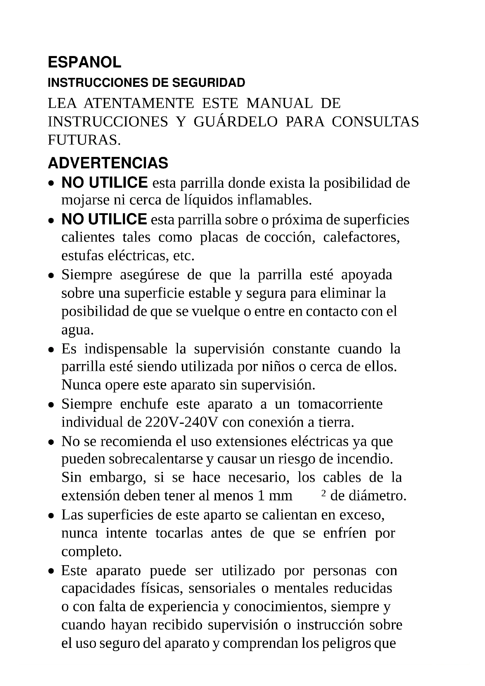 Use este aparato solamente para el propósito previsto. Esta parrilla está diseñada para usos domésticos, no es indicada para uso comercial. No utilice el aparato al aire libre.