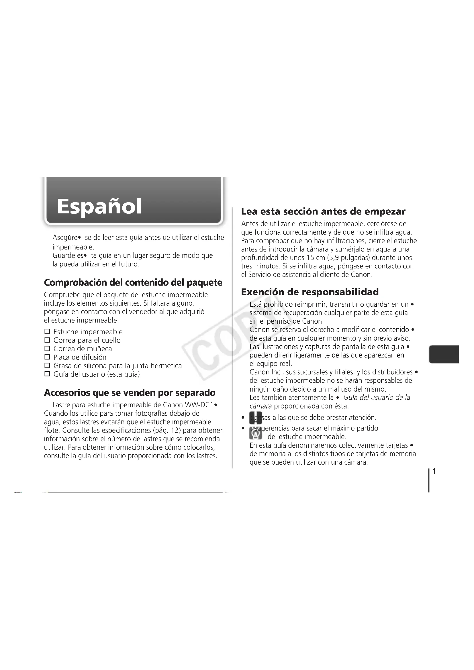 Lave cuidadosamente el estuche con agua limpia y, a continuación, séquelo por completo con un trapo seco y suave. Después de utilizar el estuche en el mar, • sumérjalo en agua limpia durante varias horas para eliminar cualquier depósito de sal. COPY12 Especificaciones Capacidad de impermeabilidad: Cumple la evaluación de protección de IEC/JIS equivalente a “IPX8” Para utilizarse a una profundidad de 40 m (130 pies) Impermeabilidad: Junta (junta tórica rizada) Material del cuerpo: Policarbonato Temperaturas de funcionamiento de la cámara: 0 a 40 °C (32 a 104 °F) Dimensiones: 139,4 x 89,7 x 115,9 mm (5,49 x 3,53 x 4,56 pulg.) (excluidos salientes) Peso: Aprox. 500 g (17,6 onzas) (Estuche impermeable solamente*) Número de lastres para estuche impermeable (WW-DC1, se venden aparte) que se recomienda montar: En agua del mar: 2 lastres En agua dulce: 1 lastre *Incluida la placa de difusión Todos los datos indicados se basan en los niveles de prueba • de Canon. Las especificaciones y la apariencia del producto están • sujetos a cambio sin previo aviso. COPYFrançais