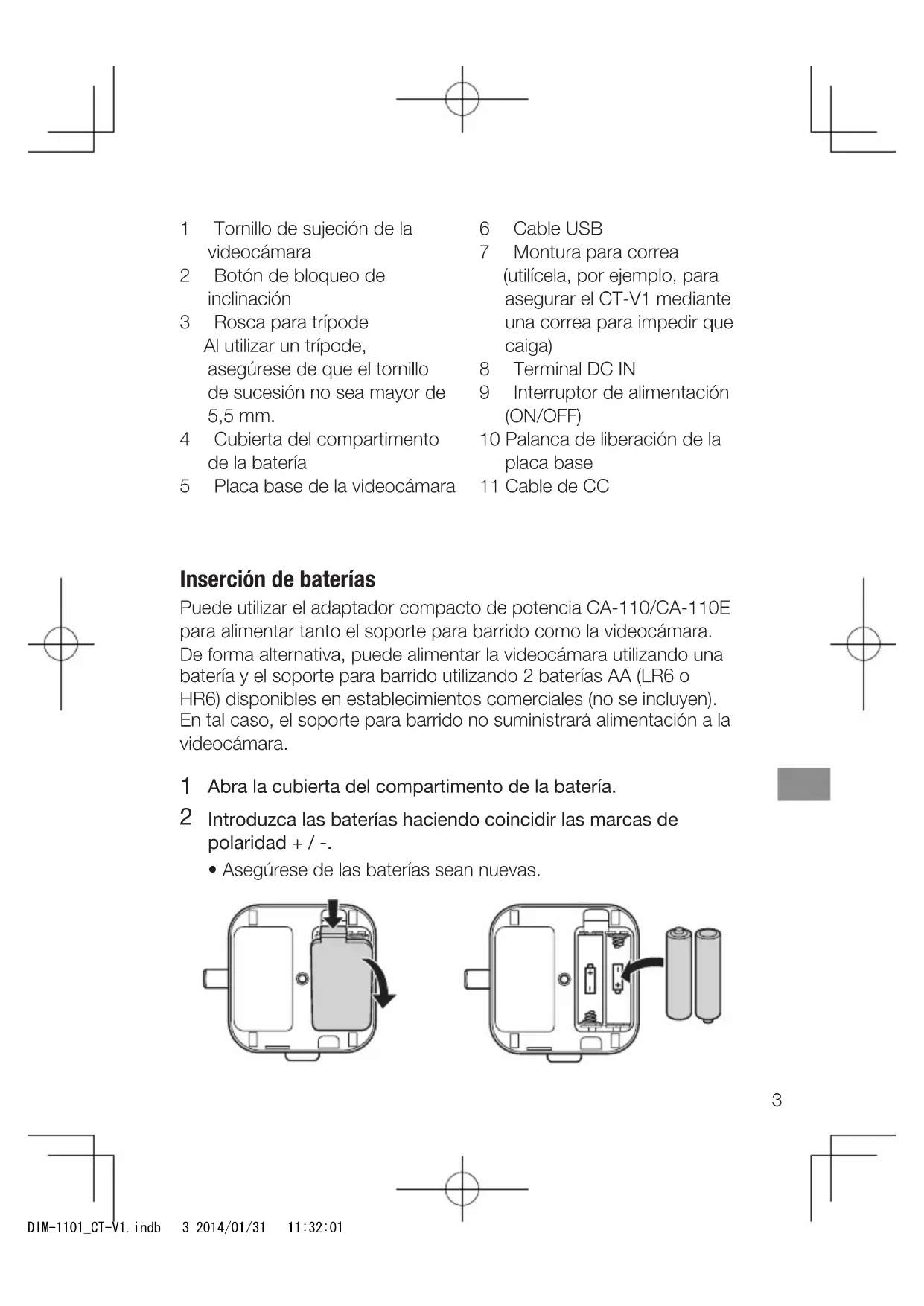 DIM-1101_CT-V1.indb 2 2014/01/31 11:32:013 1 Tornillodesujecióndela videocámara 2 Botóndebloqueode inclinación 3 Roscaparatrípode Alutilizaruntrípode, asegúresedequeeltornillo desucesiónnoseamayorde 5,5mm. 4 Cubiertadelcompartimento delabatería 5 Placabasedelavideocámara 6 CableUSB 7 Monturaparacorrea (utilícela,porejemplo,para asegurarelCT-V1mediante unacorreaparaimpedirque caiga) 8 TerminalDCIN 9 Interruptordealimentación (ON/OFF) 10Palancadeliberacióndela placabase 11CabledeCC Inserción de baterías PuedeutilizareladaptadorcompactodepotenciaCA-110/CA-110E paraalimentartantoelsoporteparabarridocomolavideocámara. Deformaalternativa,puedealimentarlavideocámarautilizandouna bateríayelsoporteparabarridoutilizando2bateríasAA(LR6o HR6)disponiblesenestablecimientoscomerciales(noseincluyen). Entalcaso,elsoporteparabarridonosuministraráalimentaciónala videocámara.
