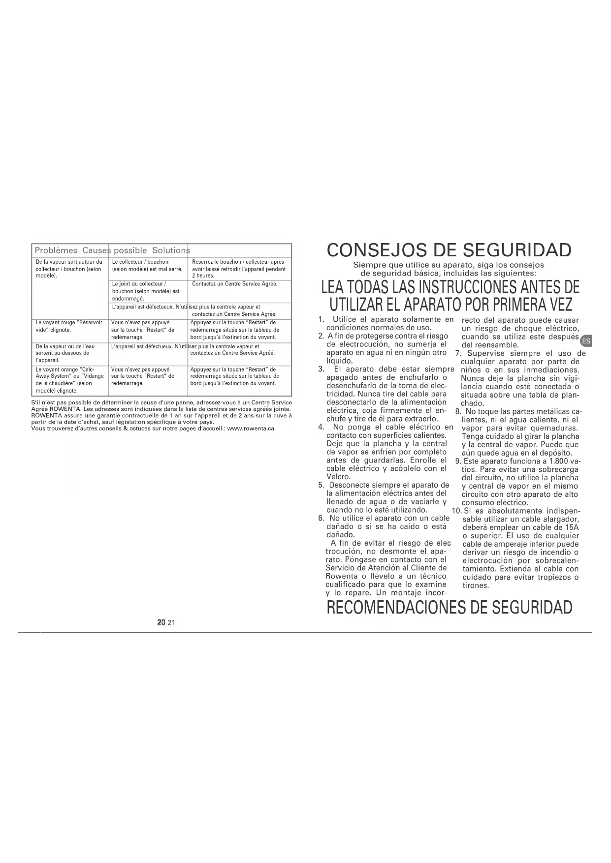 S’il n’est pas possible de déterminer la cause d’une panne, adressez-vous à un Centre ServiceAgréé ROWENTA. Les adresses sont indiquées dans la liste de centres services agréés jointe.ROWENTA assure une garantie contractuelle de 1 an sur l’appareil et de 2 ans sur la cuve à partir de la date d’achat, sauf législation spécifique à votre pays.Vous trouverez d’autres conseils & astuces sur notre pages d’accueil : www.rowenta.ca Problèmes Causes possible Solutions De la vapeur sort autour du collecteur / bouchon (selon modèle).Le collecteur / bouchon (selon modèle) est mal serré.Reserrez le bouchon / collecteur après avoir laissé refroidir l’appareil pendant 2 heures.Le joint du collecteur / bouchon (selon modèle) est endommagé.Contactez un Centre Service Agréé.L’appareil est défectueux. N’utilisez plus la centrale vapeur et contactez un Centre Service Agréé.Le voyant rouge “Réservoir vide” clignote.Vous n’avez pas appuyé sur la touche “Restart” de redémarrage.Appuyez sur la touche “Restart” de redémarrage située sur le tableau de bord jusqu’à l’extinction du voyant.De la vapeur ou de l’eau sortent au-dessous de l’appareil.L’appareil est défectueux. N’utilisez plus la centrale vapeur et contactez un Centre Service Agréé.Le voyant orange “Calc-Away System” ou “Vidange de la chaudière” (selon modèle) clignote.Vous n’avez pas appuyé sur la touche “Restart” de redémarrage.Appuyez sur la touche “Restart” de redémarrage située sur le tableau de bord jusqu’à l’extinction du voyant.