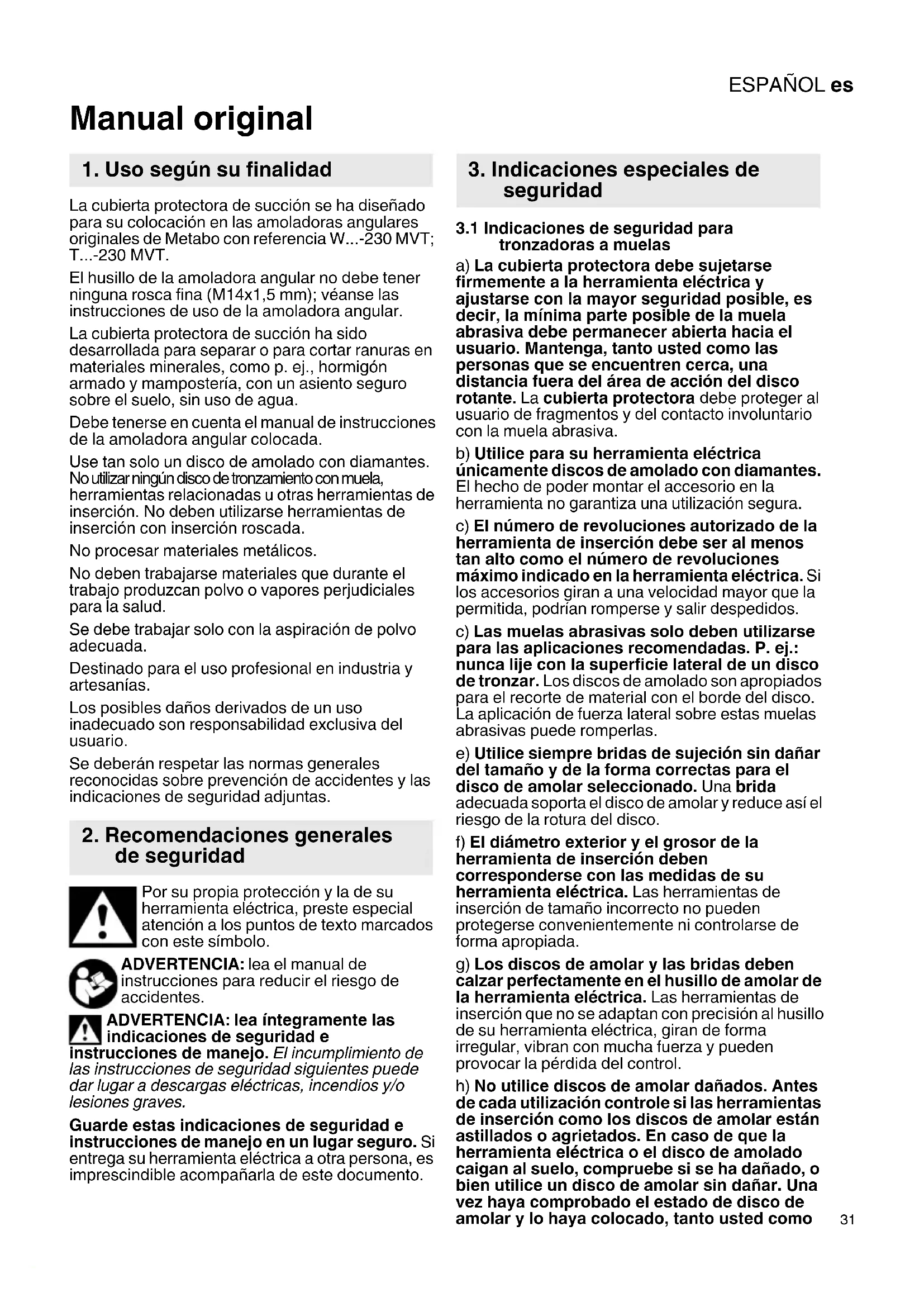 Manual original La cubierta protectora de succión se ha diseñado para su colocación en las amoladoras angulares originales de Metabo con referencia W...-230 MVT; T...-230 MVT. El husillo de la amoladora angular no debe tener ninguna rosca fina (M14x1,5 mm); véanse las instrucciones de uso de la amoladora angular. La cubierta protectora de succión ha sido desarrollada para separar o para cortar ranuras en materiales minerales, como p. ej., hormigón armado y mampostería, con un asiento seguro sobre el suelo, sin uso de agua. Debe tenerse en cuenta el manual de instrucciones de la amoladora angular colocada. Use tan solo un disco de amolado con diamantes. No utilizar ningún disco de tronzamiento con muela, herramientas relacionadas u otras herramientas de inserción. No deben utilizarse herramientas de inserción con inserción roscada. No procesar materiales metálicos. No deben trabajarse materiales que durante el trabajo produzcan polvo o vapores perjudiciales para la salud. Se debe trabajar solo con la aspiración de polvo adecuada. Destinado para el uso profesional en industria y artesanías. Los posibles daños derivados de un uso inadecuado son responsabilidad exclusiva del usuario. Se deberán respetar las normas generales reconocidas sobre prevención de accidentes y las indicaciones de seguridad adjuntas. Por su propia protección y la de su herramienta eléctrica, preste especial atención a los puntos de texto marcados con este símbolo. ADVERTENCIA: lea el manual de instrucciones para reducir el riesgo de accidentes. ADVERTENCIA: lea íntegramente las indicaciones de seguridad e instrucciones de manejo. El incumplimiento de las instrucciones de seguridad siguientes puede dar lugar a descargas eléctricas, incendios y/o lesiones graves. Guarde estas indicaciones de seguridad e instrucciones de manejo en un lugar seguro. Si entrega su herramienta eléctrica a otra persona, es imprescindible acompañarla de este documento.