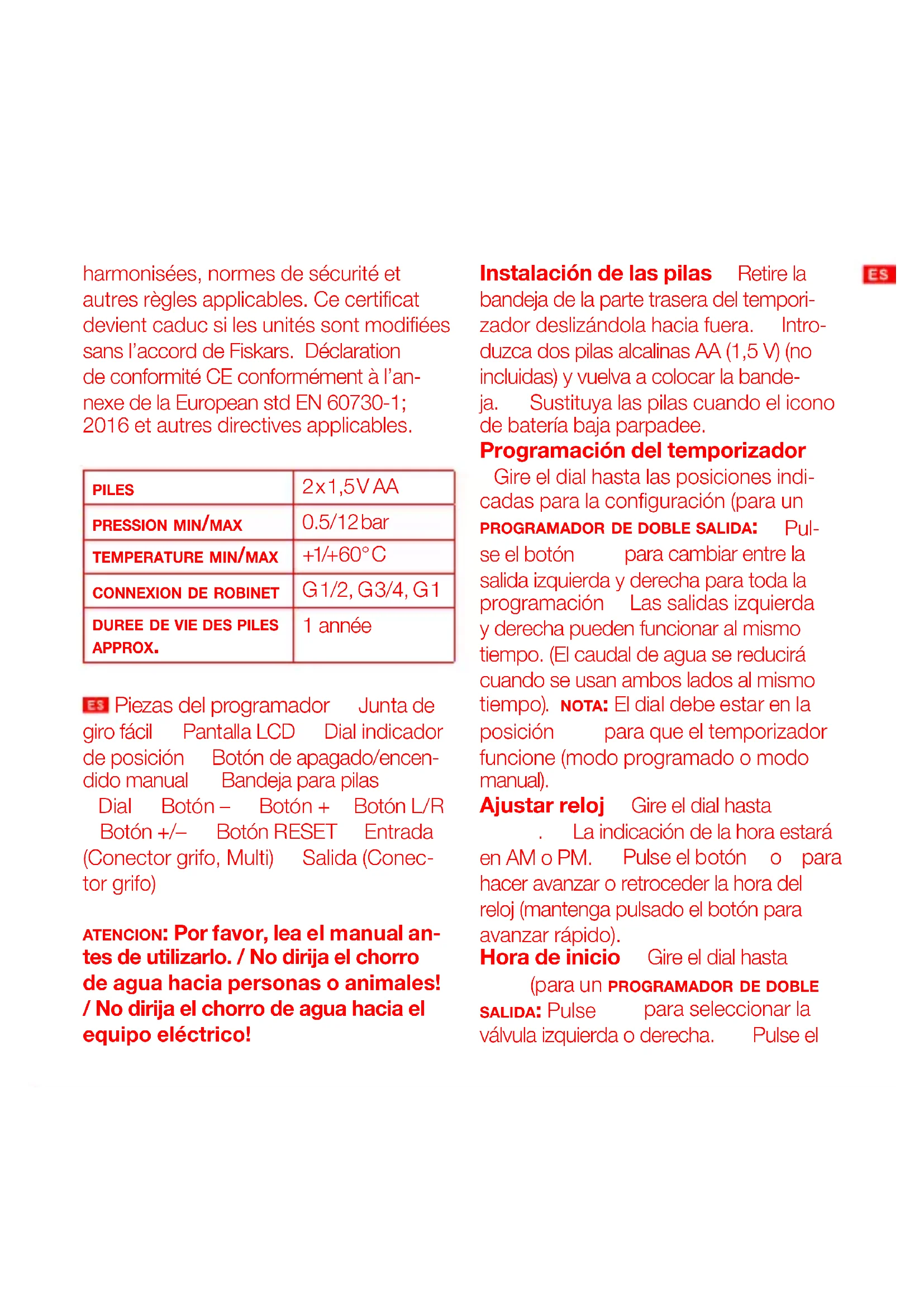 – para establecer la frecuencia. Encendido 1.Gire el dial hasta Run. 2.El temporizador riega de acuerdo con la hora, la duración y la frecuencia progra- madas. 3.Las horas de inicio y la duración de los ciclos se mantiene durante el modo O o Run. 4.El dial debe mantenerse en la posición Run para que el ciclo se inicie. Si el dial se gira a otra posición, el riego se detendrá. 5.Se mostrarán gotas de lluvia cuando el riego esté activado. Establecer retraso por lluvia (retra- so de riego) 1.Con el dial en la posición Run, pulsar (+) provocará que el programa se retrase 24 horas (para un programa- dor de doble salida: Se producirá el mismo retraso en las válvulas izquierda y derecha. 2.Es posible configurar retrasos de 0, 24, 48 y 72 horas. El tiempo de retra- so se puede cambiar pulsando + o – en cualquier momento. 3.La pantalla parpa- deará entre el reloj y las horas restantes antes de que el ciclo programado se rea- nude. 4.Para eliminar el retraso de riego, gire el dial hasta O y vuelva a girarlo a Run, o reduzca el tiempo de retraso a 0. Riego manual (al instante) 1.Para regar de inmediato sin interrumpir el ci- cloconfi gurado, pulse el botón para comenzar a regar. 2.Este modo funciona- rá solo cuando el dial esté en la posición Run. 3.Para un programador de doble salida: Seleccione la válvula izquierda o derecha (es posible programar una du- ración de riego diferente para cada vál- vula). 4.Pulse el botón + o – para ajustar de 0 a 240 minutos en cualquier momen- to. 5.Para reanudar el ciclo programado, pulse el botón de nuevo o gire el pomo hasta O y de nuevo a Run. Apagado Girar el dial hasta O desde cualquier otra posición detendrá el riego manual o programado de inmediato. Restablecer Pulsar el botón Reset durante 2 segundos eliminará todos los programas y el temporizador volverá a su estado de fábrica. Instalación 1.Conecte el temporizador a una llave de manguera exterior y abra la llave tras programarlo. 2.No debe utilizar- se en el extremo “Y” de los conectores oen otros accesorios para mangueras. Solución de problemas problema: La pantalla no se enciende. Compruebe si: 1.Las pilas están colo- cadas correctamente. 2.Las pilas tienen muy poca carga. problema: El temporizador no riega o no se activa a la hora deseada. Compruebe si: 1.La posición del dial es Run. 2.La llave está abierta. 3.El reloj está configurado a la hora correcta, AM o PM. 4.Las pilas tienen poca carga. 5.Para un programador de doble salida: La salida deseada (izquierda o derecha) está programada. 6.El retraso de riego está activado. 7.La hora de inicio está configurada a la hora deseada, AM o PM. problema: El agua no se detiene. Compruebe si: 1.La duración del riego está configurada a la hora deseada. 2.El modo manual está activado. 3.No hay corriente/pilas. Términos de garantía El fabricante se compromete a reparar o eventualmente a sustituir, a través del vendedor, durante un periodo de 24 meses desde la fecha de compra, aquellas partes del producto que manifestaran defectos de fabricación. quedan excluidos los defectos debi- dos a manipulaciones indebidas, uso impropio o desgaste. Para que la garantía tenga validez, el usuario tiene que entre- gar al vendedor el producto. Declaración de conformidad de la UE Por el presente, Fiskars Oy (Finlandia) certifica que los productos temporizador simple y doble, al salir de la fábrica de Fiskars, cumplen las directrices armo- nizadas de la UE, las normas de la UE sobre seguridad y las normas específicas del producto. Este certificado dejará de ser válido si las unidades se modifican sin la aprobación de Fiskars. Declaración de conformidad de la CE de acuerdo con la directiva European std EN 60730-1; 2016 y otras directivas aplicables. batería 2 x 1,5 V AA presión mínima/ máxima 0.5/12 bar temperatura mínima/ máxima +1/+ 6 0 ° C conexión del grifo G 1/2, G 3/4, G 1 tiempo de funcionam- iento de las baterías aprox. 1 Año Peças para Programadores A.União móvel fácil B.Visor LCD C.Indi- cador de posição do disco D.Botão paraligar/desligar manual E.Tabuleiro das pilhas F.Disco G.Botão– H.Botão+ I.Botão L/R J.Botão+/– K.Botão RE- SET L.Entrada (Ligação para torneira, Multi) M.Saída (Ligação para torneira) atenção: Por favor, leia o manual an- tes de utilisar. / Não direcione o jato de água para pessoas ou animais! / Não direcione o jato de água para o equipamento elétrico! Instalar as pilhas 1.Remova o tabuleiro da parte posterior do Temporizador fa- zendo-o deslizar para fora. 2.Insira duas pilhas AA (1,5 V) alcalinas (não incluídas) e volte a colocar o tabuleiro. 3.Substitua as pilhas quando o ícone de pouca carga das pilhas piscar. Programar o temporizador 1.Rode o disco para as posições indicadas para configuração (para temporizador dupla saida: 2.Prima o botão L/R para alternar entre a saída esquerda e a saída direita para toda a programação 3.As saídas es- querda e direita podem funcionar simul- taneamente. (O causal de água diminuirá quando ambas as saídas forem utilizadas simultaneamente.) nota: o disco tem de estar na posição Run (funcionar) para que o Temporizador funcione (modo programado ou modo Manual). Acertar o relógio 1.Rode o disco para Set clock. 2.A hora será mostrada em AM ou PM. 3.Prima o botão + ou – para avançar ou recuar a hora (prima o bo- tão sem soltar para avançar ou recuar rapidamente). Hora de início 1.Rode o disco para Start time ( para temporizador dupla saida : Prima L/R para escolher a válvu- la esquerda ( L) ou direita (R). 2.Prima o botão + ou – para definir a hora de início (prima o botão sem soltar para avançar ou recuar rapidamente). Duração 1.Rode o disco para How long. 2.Prima o botão + ou – para definir a dura- ção da rega (entre 1 minuto e 360 minutos). Frequência 1.Permite-lhe definir o pro- grama para repetir a intervalos de 6 ho- ras, 12 horas ou entre 1 e 7 dias. 2.Rode o disco para How 