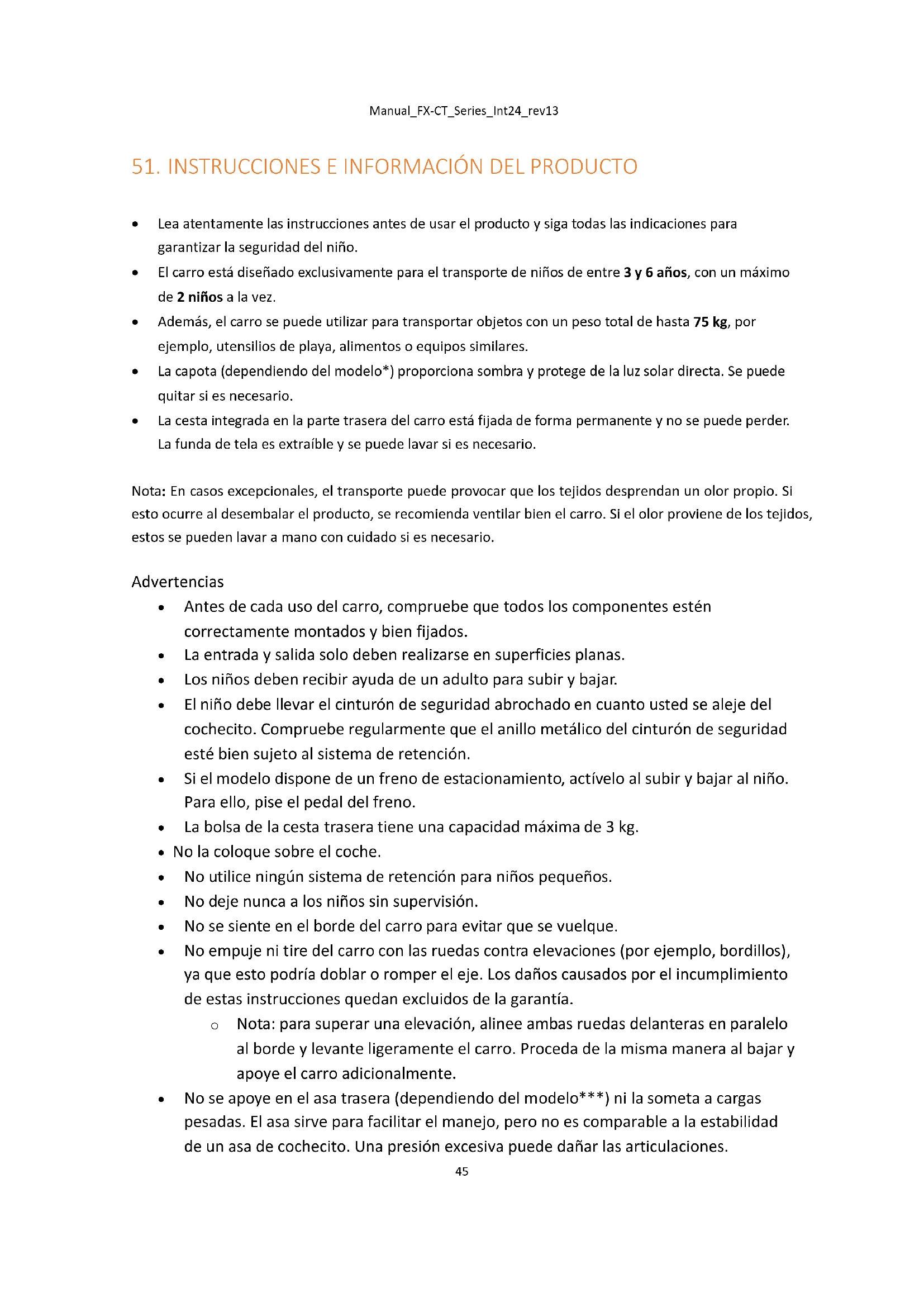 - No se apoye en el asa trasera (dependiendo del modelo***) ni la someta a cargas pesadas. El asa sirve para facilitar el manejo, pero no es comparable a la estabilidad de un asa de cochecito. Una presión excesiva puede dañar las articulaciones.Manual_FX-CT_Series_Int24_rev13