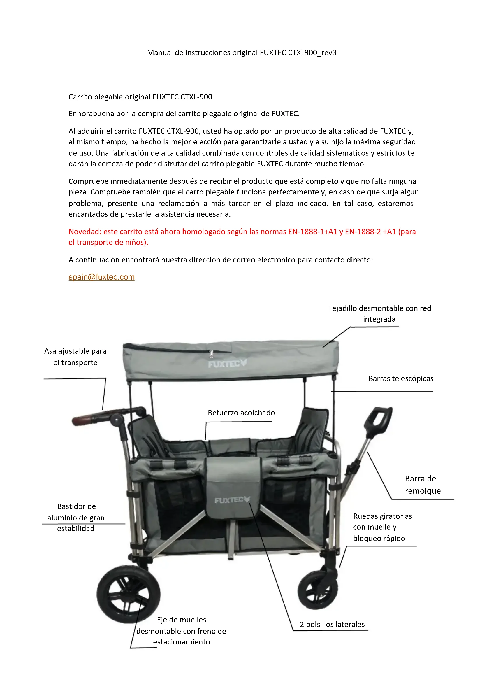 Carrito plegable original FUXTEC CTXL-900 Enhorabuena por la compra del carrito plegable original de FUXTEC. Al adquirir el carrito FUXTEC CTXL-900, usted ha optado por un producto de alta calidad de FUXTEC y, al mismo tiempo, ha hecho la mejor elección para garantizarle a usted y a su hijo la máxima seguridad de uso. Una fabricación de alta calidad combinada con controles de calidad sistemáticos y estrictos te darán la certeza de poder disfrutar del carrito plegable FUXTEC durante mucho tiempo. Compruebe inmediatamente después de recibir el producto que está completo y que no falta ninguna pieza. Compruebe también que el carro plegable funciona perfectamente y, en caso de que surja algún problema, presente una reclamación a más tardar en el plazo indicado. En tal caso, estaremos encantados de prestarle la asistencia necesaria. Novedad: este carrito está ahora homologado según las normas EN-1888-1+A1 y EN-1888-2 +A1 (para el transporte de niños). A continuación encontrará nuestra dirección de correo electrónico para contacto directo: spain@fuxtec.com.