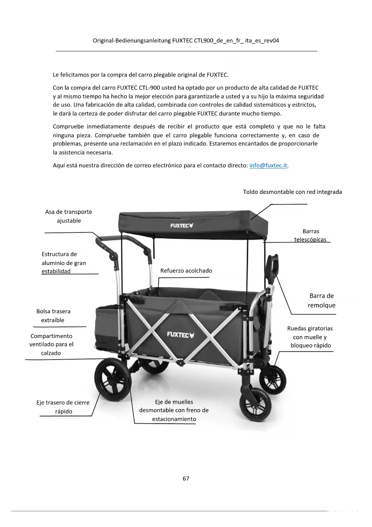 Le felicitamos por la compra del carro plegable original de FUXTEC. Con la compra del carro FUXTEC CTL-900 usted ha optado por un producto de alta calidad de FUXTEC y al mismo tiempo ha hecho la mejor elección para garantizarle a usted y a su hijo la máxima seguridad de uso. Una fabricación de alta calidad, combinada con controles de calidad sistemáticos y estrictos, le dará la certeza de poder disfrutar del carro plegable FUXTEC durante mucho tiempo. Compruebe inmediatamente después de recibir el producto que está completo y que no le falta ninguna pieza. Compruebe también que el carro plegable funciona correctamente y, en caso de problemas, presente una reclamación en el plazo indicado. Estaremos encantados de proporcionarle la asistencia necesaria. Aquí está nuestra dirección de correo electrónico para el contacto directo: info@fuxtec.it.
