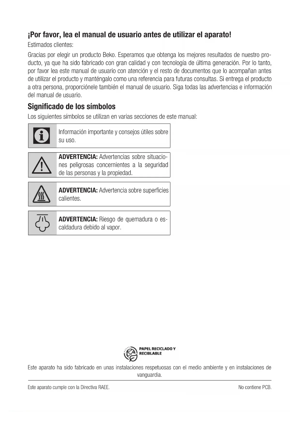 ADVERTENCIA: Advertencias sobre situacio- nes peligrosas concernientes a la seguridad de las personas y la propiedad. ADVERTENCIA: Advertencia sobre superficies calientes. ADVERTENCIA: Riesgo de quemadura o es- caldadura debido al vapor. Este aparato cumple con la Directiva RAEE. Este aparato ha sido fabricado en unas instalaciones respetuosas con el medio ambiente y en instalaciones de vanguardia. No contiene PCB.30 / ES Plancha de vapor / Manual de usuario Control y piezas