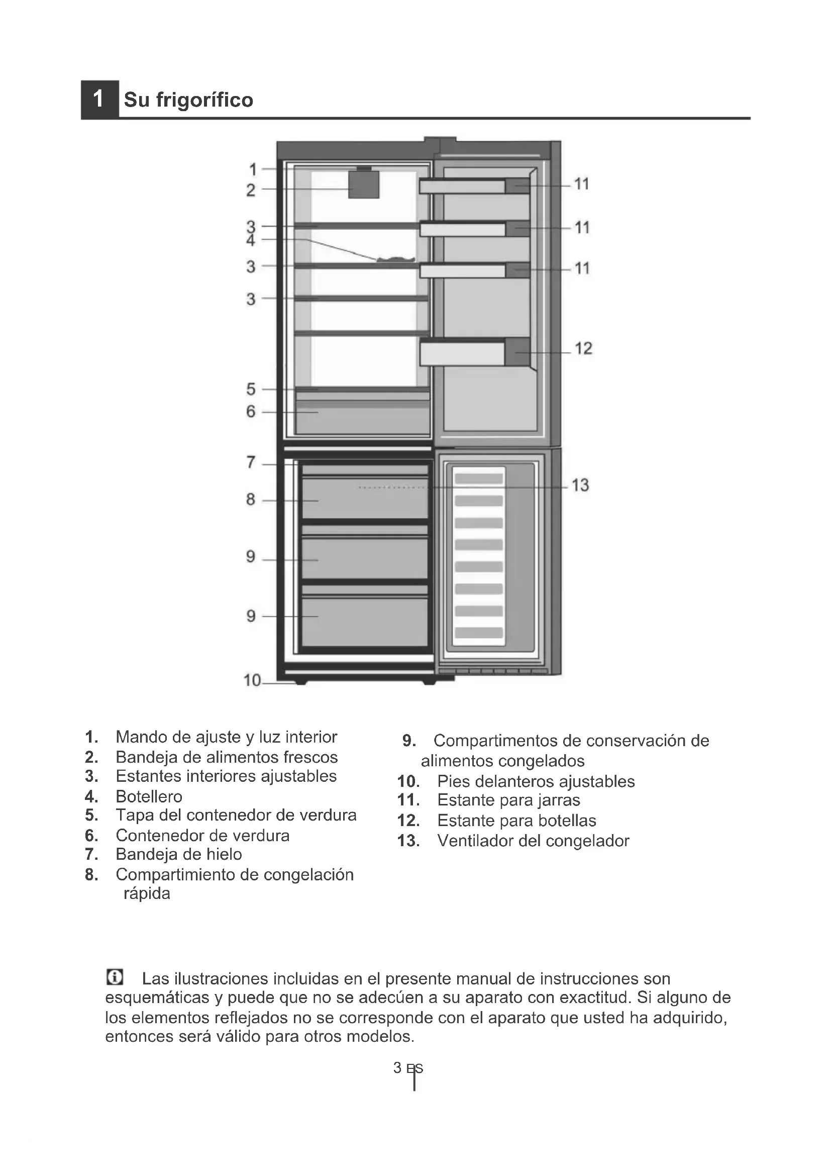 Mando de ajuste y luz interior Bandeja de alimentos frescos Estantes interiores ajustables Botellero Tapa del contenedor de verdura Contenedor de verdura Bandeja de hielo Compartimiento de congelación rápida &RPSDUWLPHQWRVGHFRQVHUYDFLyQGH DOLPHQWRVFRQJHODGRV 3LHVGHODQWHURVDMXVWDEOHV (VWDQWHSDUDMDUUDV (VWDQWHSDUDERWHOODV 9HQWLODGRUGHOFRQJHODGRU Las ilustraciones incluidas en el presente manual de instrucciones son esquemáticas y puede que no se adecúen a su aparato con exactitud. Si alguno de los elementos reflejados no se corresponde con el aparato que usted ha adquirido, entonces será válido para otros modelos. 3 ESInformación importante sobre seguridad