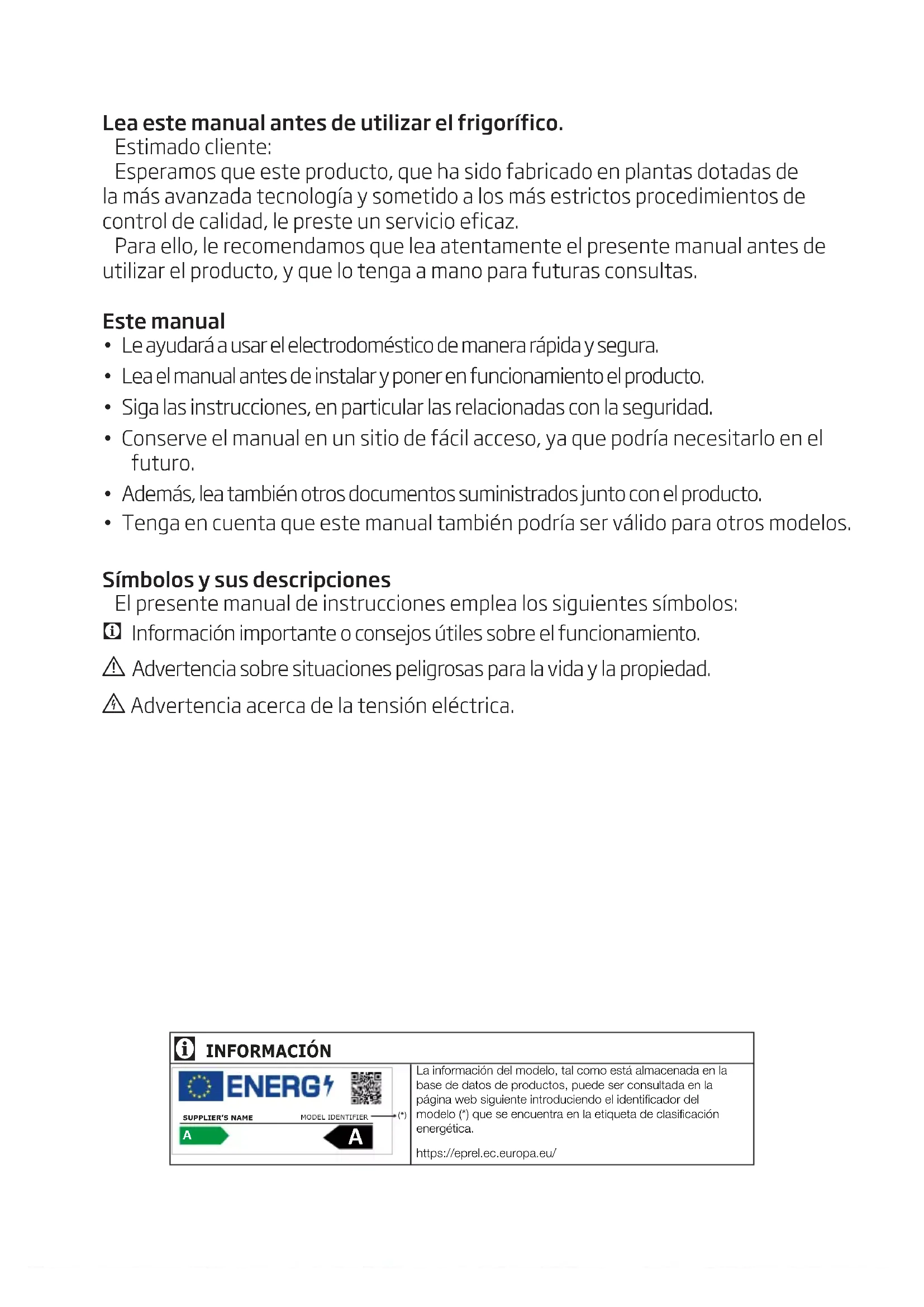 La información del modelo, tal como está almacenada en la base de datos de productos, puede ser consultada en la página web siguiente introduciendo el identificador del modelo (*) que se encuentra en la etiqueta de clasificación energética.https://eprel.ec.europa.eu/