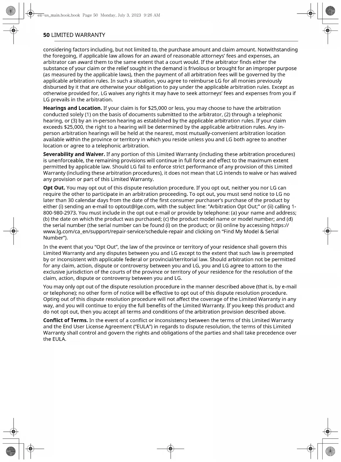 Refrigerador/ Congelador Sistema Sellado (Condensador, Filtro desecante, Tubo Conector y Evaporador) Compresor Dos (2) años a partir de la fecha original de compraCinco (5) años a partir de la fecha original de compraCinco (5) años a partir de la fecha original de compraSolo compresor lineal/inversor: solo partes durante 6-10 años a partir de la fecha original de compra (Usted deberá pagar la mano de obra).Piezas y mano de obra (solo piezas internas/ funcionales)Piezas y mano de obra Piezas y mano de obraes-us_main.book.book Page 48 Monday, July 3, 2023 9:40 AMloading-circle-150 GARANTÍA LIMITADA TRAVÉS DE UN ARBITRAJE VINCULANTE Y NO EN UNA CORTE DE JURISDICCIÓN GENERAL. ARBITRAJE VINCULANTE SIGNIFICA QUE USTED Y LG RENUNCIAN AL DERECHO DE UN JUICIO CON JURADO Y A REALIZAR O PARTICIPAR EN UNA DEMANDA COLECTIVA. Definiciones. Para el propósito de esta sección, las referencias a “LG” significan: LG Electronics U.S.A., Inc., sus empresas matrices, subsidiarias y filiales y cada uno de sus directivos, directores, empleados, agentes, beneficiarios, predecesores en interés, sucesores, cesionarios y proveedores; las referencias a “conflicto” o “reclamación” incluirán cualquier conflicto, reclamo o controversia de cualquier tipo, sin importar (ya sea basado en contrato, agravio, estatuto, regulación, ordenanza, fraude, falsa representación o cualquier teoría legal o equitativa) que surja de o esté relacionada con cualquier forma de venta, condición o desempeño del producto o de esta Garantía Limitada. Aviso de disputa. En caso de que usted desee iniciar un procedimiento de arbitraje, primero debe notificar a LG por escrito al menos 30 días antes de iniciar el arbitraje enviando una carta a LG a LG Electronics, USA, Inc. Atención: Legal Department- Arbitration 111 Sylvan Avenue, Englewood Cliffs, NJ 07632. Usted y LG aceptan participar en discusiones de buena fe en un intento de resolver su reclamo de manera amistosa. En la carta debe proporcionar su nombre, dirección y número de teléfono; identificar el producto que es objeto de la reclamación; y describir la naturaleza del reclamo y el remedio que busca. Si usted y LG no pueden resolver la disputa dentro de 30 días, cualquiera de las partes puede proceder a presentar una demanda de arbitraje. Acuerdo de arbitraje vinculante y renuncia de demanda colectiva. En caso de no resolver la disputa durante el período de 30 días después de enviar una notificación por escrito a LG, Usted y LG se comprometen a resolver cualquier reclamo entre nosotros, solamente a través de arbitraje vinculante sobre una base individual, a menos que usted se excluya, conforme a lo dispuesto a continuación. Cualquier conflicto entre usted y LG no estarán combinados o consolidados con una controversia relacionada con cualquier otro producto o reclamo de otra persona o entidad. Más específicamente y sin prejuicio de lo anterior, no procederá bajo ninguna circunstancia cualquier disputa entre usted y LG como parte de una acción colectiva o representativa. En lugar del arbitraje, cualquiera de las partes podrá iniciar una acción individual en la corte de reclamos menores, pero tales acciones en la corte de reclamos menores no podrán ser realizadas en una acción colectiva o representativa. Normas y procedimientos de arbitraje. Para comenzar con el arbitraje de un reclamo, usted o LG deben realizar una demanda escrita para arbitraje. El arbitraje será administrado por la Asociación Americana de Arbitraje (AAA) y se llevará a cabo ante un árbitro único bajo las Normas de Arbitraje del Consumidor de la AAA, que tienen efecto al momento de inicio del arbitraje (en adelante “Normas de la AAA”) y bajo los procedimientos establecidos en esta sección. Las Normas de la AAA están disponibles en línea en www.adr.org/consumer. Envíe una copia de su solicitud de arbitraje por escrito, así como una copia de esta disposición, a la AAA de la forma descrita en las Normas de la AAA. También debe enviar una copia de su solicitud por escrito a LG en LG Electronics, USA, Inc. Atención: Legal Department- Arbitration 111 Sylvan Avenue, Englewood Cliffs, NJ 07632. Si hay un conflicto entre las Normas de la AAA y las reglas establecidas en esta sección, prevalecerán dichas reglas de esta sección. Esta disposición de arbitraje se rige por la Ley Federal de Arbitraje. El juicio se puede introducir en el laudo arbitral en cualquier tribunal de jurisdicción competente. Todos son temas para que el árbitro tome sus decisiones, excepto aquellos asuntos relativos al alcance y aplicabilidad de la cláusula de arbitraje y de la cap acidad de arbitraje de la controversia para que el tribunal decida. El árbitro se regirá por los términos de esta disposición. Legislación vigente. La legislación del estado de su residencia regirá esta Garantía Limitada, así como todas las disputas entre nosotros, salvo que sea invalidada o inconsistente con leyes federales aplicables. Tarifas / Costos. Usted no debe pagar ninguna tarifa para comenzar un arbitraje. Al recibir su solicitud de arbitraje por escrito, LG pagará todos los gastos administrativos rápidamente a la AAA, a menos que usted solicite más de $25,000.00 por daños, en cuyo caso el pago de estos gastos se regirá por las Normas de la AAA. Salvo disposición contraria prevista en el presente documento, LG pagará a la AAA todos los gastos documentales, administrativos y de arbitraje para cualquier arbitraje iniciado, de conformidad con las Normas de la AAA y esta disposición de arbitraje. Si usted prevalece en el arbitraje, LG pagará los honorarios y gastos de sus abogados, siempre y cuando sean razonables, considerando factores que incluyen, entre otros, el monto de la compra y el monto del reclamo. No obstante lo anterior, si la ley aplicable permite una adjudicación de honorarios y gastos razonables de abogados, un árbitro puede otorgarlos en la misma medida que lo haría 