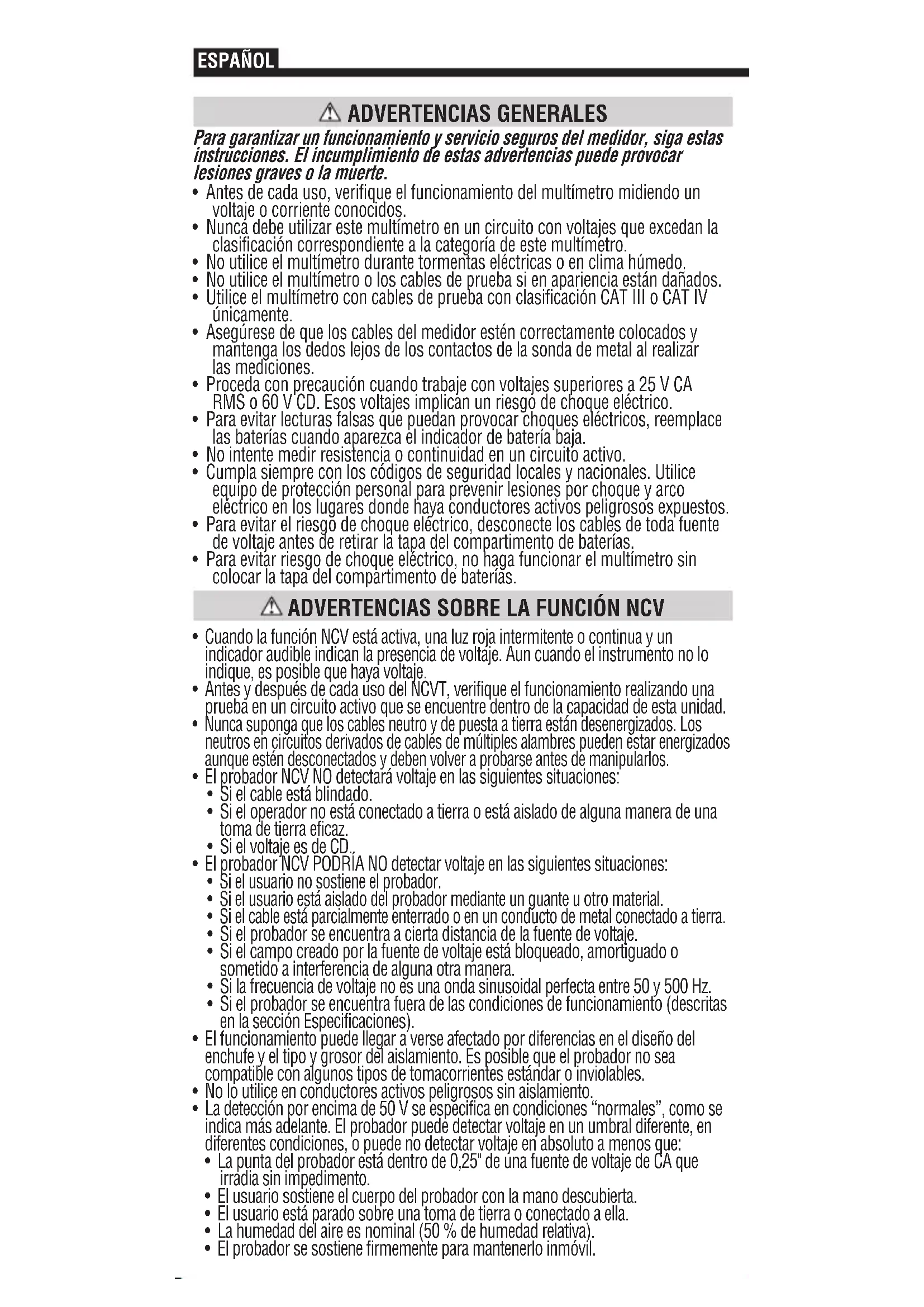 - Antes y después de cada uso del NCVT, verifique el funcionamiento realizando una prueba en un circuito activo que se encuentre dentro de la capacidad de esta unidad.