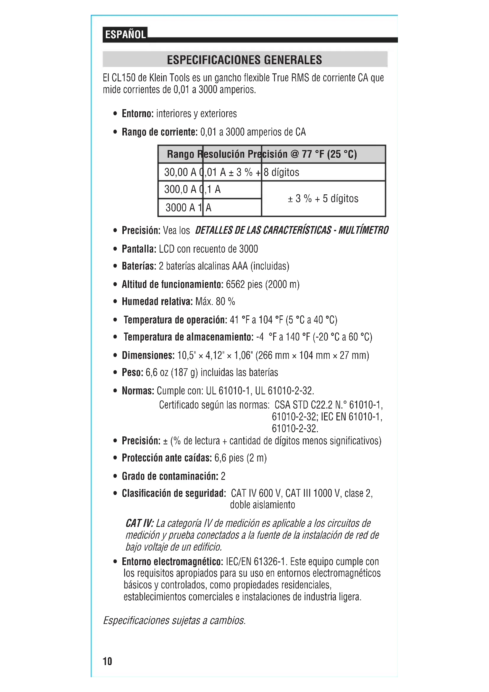 Multímetro de gancho exible corriente CA 3000 A10 ESPAÑOL ESPECIFICACIONES GENERALES El CL150 de Klein Tools es un gancho flexible True RMS de corriente CA que mide corrientes de 0,01 a 3000amperios.