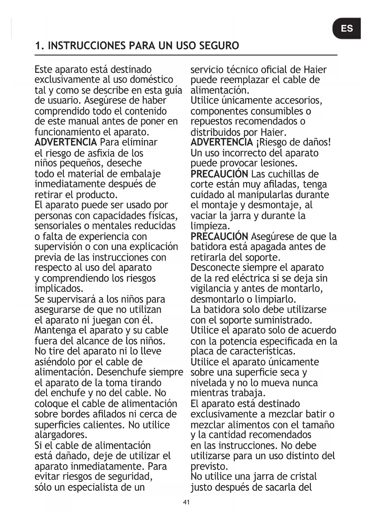 PT41 Este aparato está destinado exclusivamente al uso doméstico tal y como se describe en esta guía de usuario. Asegúrese de haber comprendido todo el contenido de este manual antes de poner en funcionamiento el aparato. ADVERTENCIA Para eliminar el riesgo de asxia de los niños pequeños, deseche todo el material de embalaje inmediatamente después de retirar el producto. El aparato puede ser usado por personas con capacidades físicas, sensoriales o mentales reducidas o falta de experiencia con supervisión o con una explicación previa de las instrucciones con respecto al uso del aparato y comprendiendo los riesgos implicados. Se supervisará a los niños para asegurarse de que no utilizan el aparato ni juegan con él. Mantenga el aparato y su cable fuera del alcance de los niños. No tire del aparato ni lo lleve asiéndolo por el cable de alimentación. Desenchufe siempre el aparato de la toma tirando del enchufe y no del cable. No coloque el cable de alimentación sobre bordes alados ni cerca de supercies calientes. No utilice alargadores. Si el cable de alimentación está dañado, deje de utilizar el aparato inmediatamente. Para evitar riesgos de seguridad, sólo un especialista de un servicio técnico ocial de Haier puede reemplazar el cable de alimentación. Utilice únicamente accesorios, componentes consumibles o repuestos recomendados o distribuidos por Haier. ADVERTENCIA ¡Riesgo de daños! Un uso incorrecto del aparato puede provocar lesiones. PRECAUCIÓN Las cuchillas de corte están muy aladas, tenga cuidado al manipularlas durante el montaje y desmontaje, al vaciar la jarra y durante la limpieza. PRECAUCIÓN Asegúrese de que la batidora está apagada antes de retirarla del soporte. Desconecte siempre el aparato de la red eléctrica si se deja sin vigilancia y antes de montarlo, desmontarlo o limpiarlo. La batidora solo debe utilizarse con el soporte suministrado. Utilice el aparato solo de acuerdo con la potencia especicada en la placa de características. Utilice el aparato únicamente sobre una supercie seca y nivelada y no lo mueva nunca mientras trabaja. El aparato está destinado exclusivamente a mezclar batir o mezclar alimentos con el tamaño y la cantidad recomendados en las instrucciones. No debe utilizarse para un uso distinto del previsto. No utilice una jarra de cristal justo después de sacarla del