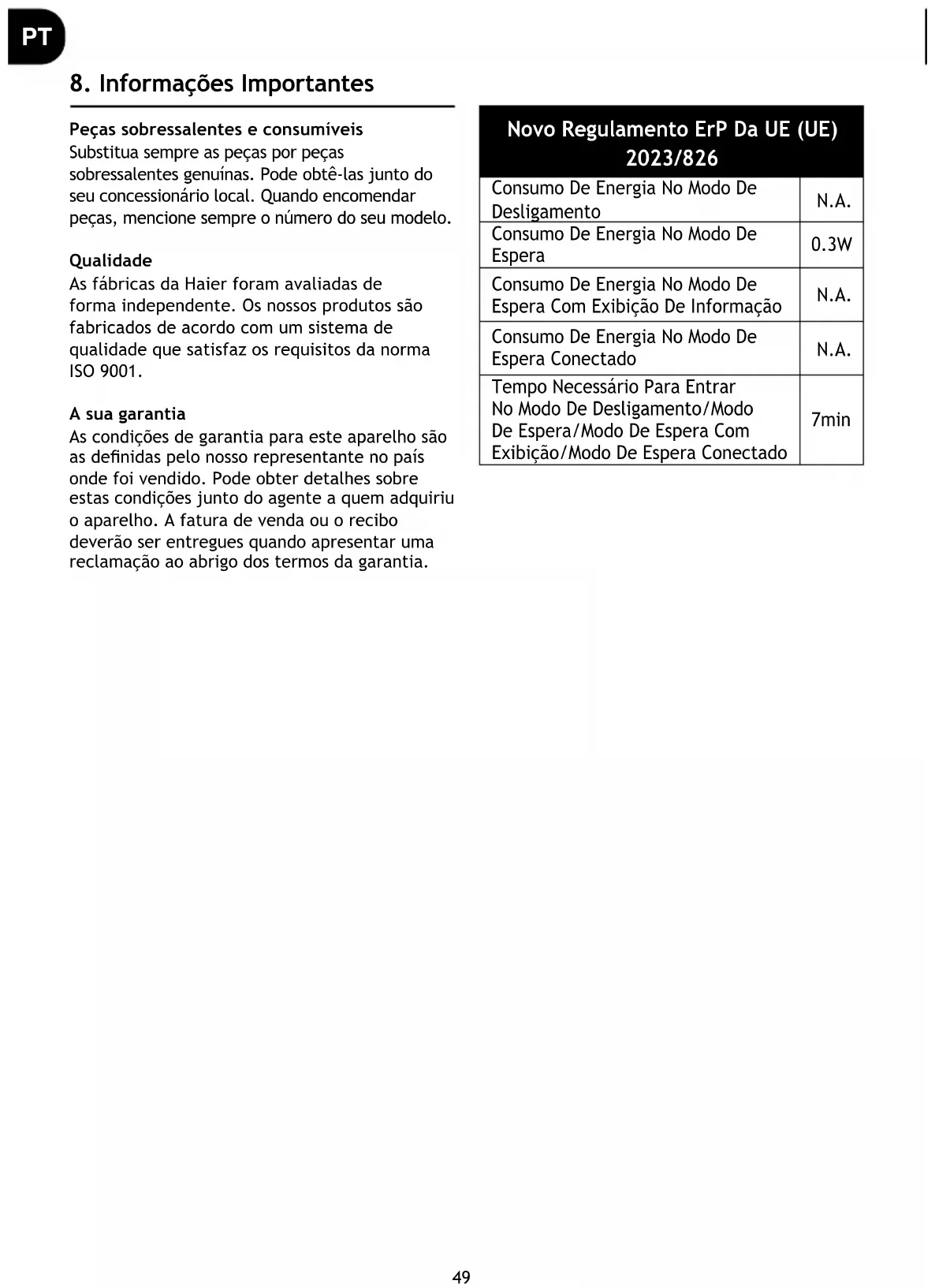 Novo Regulamento ErP Da UE (UE) 2023/826 Consumo De Energia No Modo De Desligamento N.A. Consumo De Energia No Modo De Espera 0.3W Consumo De Energia No Modo De Espera Com Exibição De Informação N.A. Consumo De Energia No Modo De Espera Conectado N.A. Tempo Necessário Para Entrar No Modo De Desligamento/Modo De Espera/Modo De Espera Com Exibição/Modo De Espera Conectado 7min50 Este aparato está destinado exclusivamente al uso doméstico y de interior, tal y como se describe en esta guía del usuario. Asegúrese de haber comprendido todo el contenido de este manual antes de poner en funcionamiento el aparato. ADVERTENCIA: Para eliminar el riesgo de asxia de los niños pequeños, deseche todo el material de embalaje inmediatamente después de retirar el producto. El paquete de papel para los accesorios puede estar presente en el interior del aparato dependiendo de los modelos que haya adquirido, retire todo el paquete antes de utilizar el aparato para evitar el riesgo de incendio. Este aparato puede ser usado bajo supervisión por niños mayores de 8 años o por personas con capacidades físicas, sensoriales o mentales reducidas o falta de experiencia con supervisión o con una explicación previa de las instrucciones con respecto al uso del aparato y comprendiendo los riesgos implicados. Los niños no deben jugar con el aparato. La limpieza y el mantenimiento del usuario no deben ser realizados por niños a menos que sean mayores de 8 años y estén supervisados. Mantenga el aparato y su cable fuera del alcance de los niños menores de 8 años. Si el cable de alimentación está dañado, deje de utilizar el aparato inmediatamente. Para evitar peligros de seguridad, solo profesionales del servicio técnico de Haier deben reemplazar el cable de alimentación. Utilice únicamente accesorios, componentes consumibles o repuestos recomendados o distribuidos por Haier. El uso de accesorios o complementos no recomendados por Haier puede causar lesiones. Utilice el aparato solo de acuerdo con la potencia especicada en la placa de características. ADVERTENCIA: ¡Riesgo de quemaduras! No toque nunca el interior del aparato mientras esté en uso y después de su funcionamiento. La resistencia está sujeta a calor residual después de su uso. Utilice siempre el asa para transportar la cesta. Pulse el botón de desbloqueo de las cestas únicamente con estas apoyadas sobre una encimera (o cualquier supercie nivelada y resistente al calor). No bloquee ninguna abertura de ventilación. El vapor caliente se libera a través de las salidas de aire. Mantenga las manos y la cara alejadas del vapor caliente y de las aberturas. Tenga cuidado también con el vapor y el aire