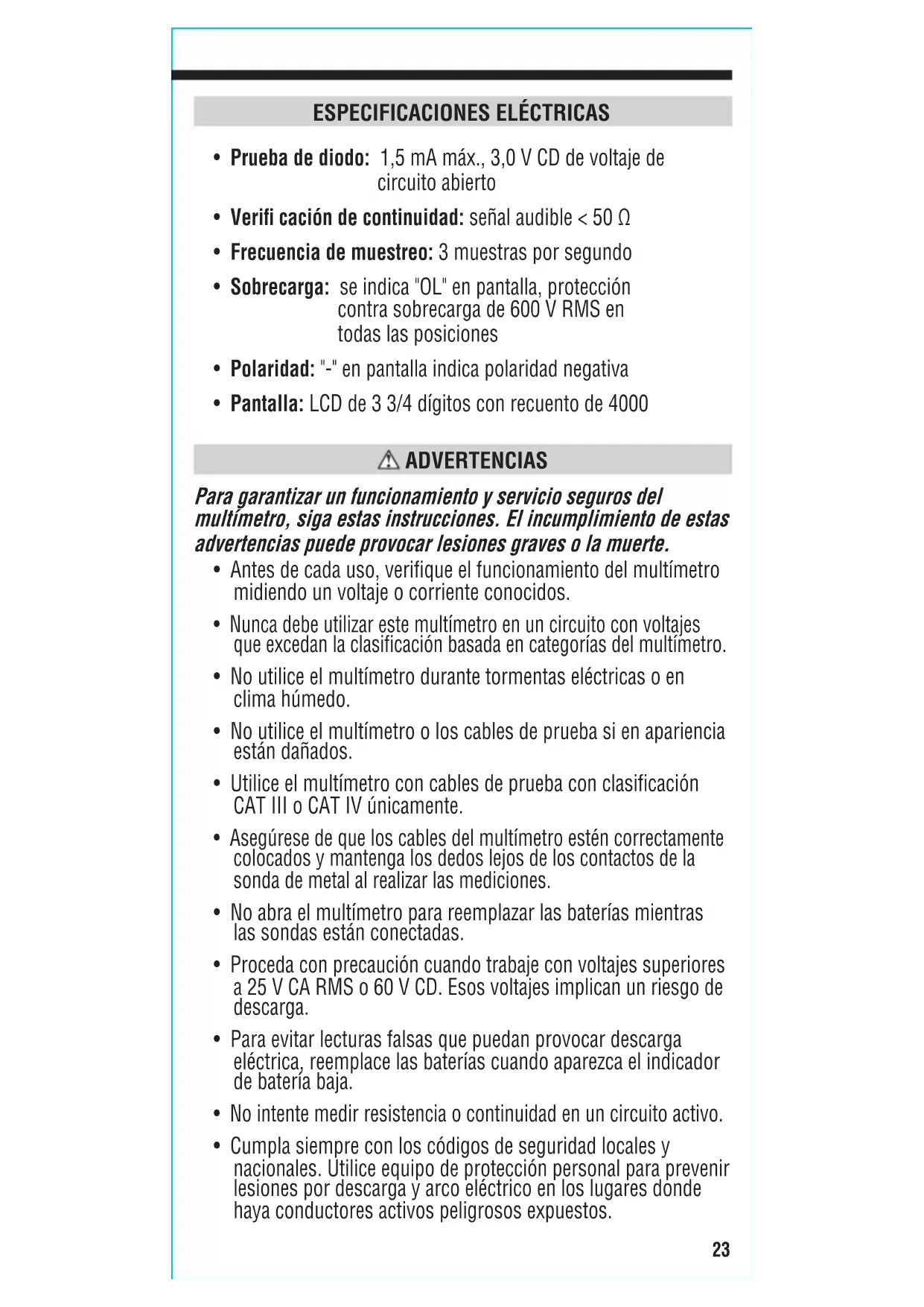 - Pantalla: LCD de 3 3/4 dígitos con recuento de 4000 ADVERTENCIAS Para garantizar un funcionamiento y servicio seguros del multímetro, siga estas instrucciones. El incumplimiento de estas advertencias puede provocar lesiones graves o la muerte.